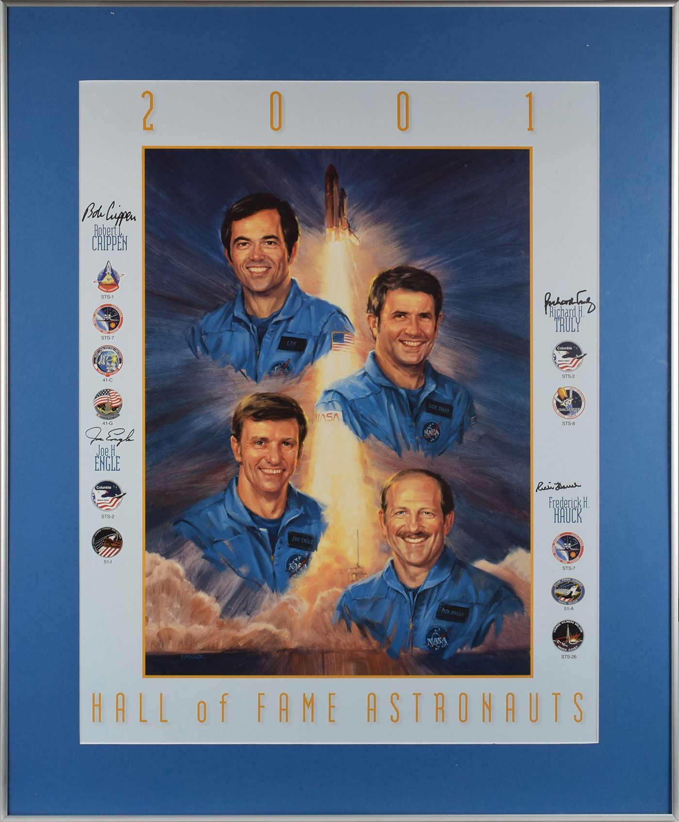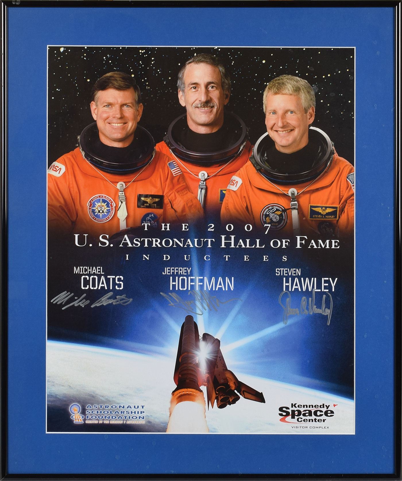 Two items: a color 21.5 x 27.5 lithograph of the 2001 inductees into the Astronaut Hall of Fame, showing images of Bob Crippen, Joe Engle, Richard Truly, and Fred Hauck by artist Tom Fricker, with each astronaut signing above their mission emblems in black felt tip; and a color 15.5 x 19.5 poster honoring Michael Coats, Jeffrey Hoffman, and Steven Hawley as the 2007 inductees into the Astronaut Hall of Fame, showing each astronaut above a soaring Space Shuttle, signed below their respective images in silver ink. The Fricker lithograph is matted and framed to an overall size of 28.25 x 34.25, and the 2007 poster is matted and framed to an overall size of 20.25 x 24.25. In overall fine condition.