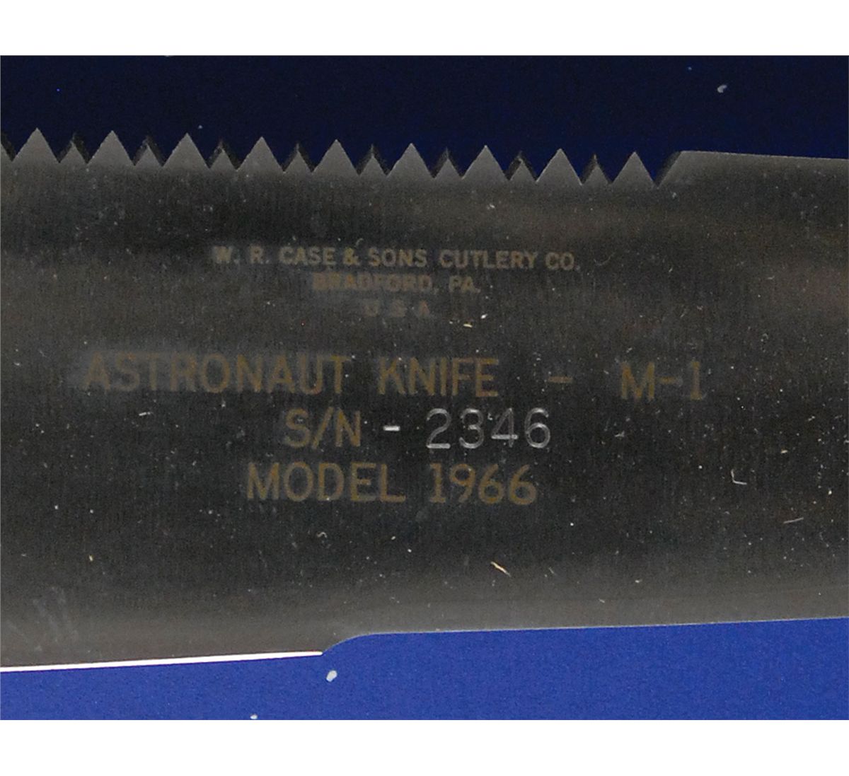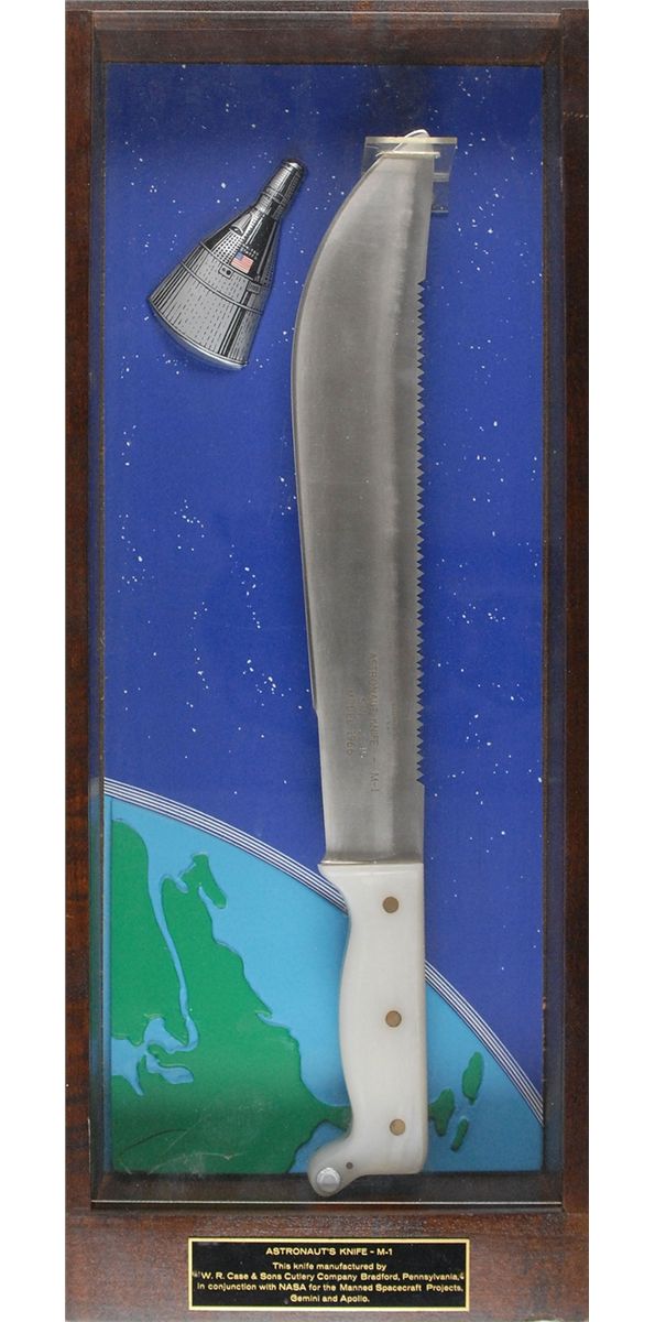 Limited edition Astronaut Knife M-1 manufactured by W. R. Case and Sons. Machete-style knife measures 16.5? in length and is numbered 2346 on the stainless steel blade, which features one straight edge and one serrated. Knife also boasts a special polypropylene handle, and is housed in its original 20.5 x 8.5 display case, complete with informational plaque. In fine condition.