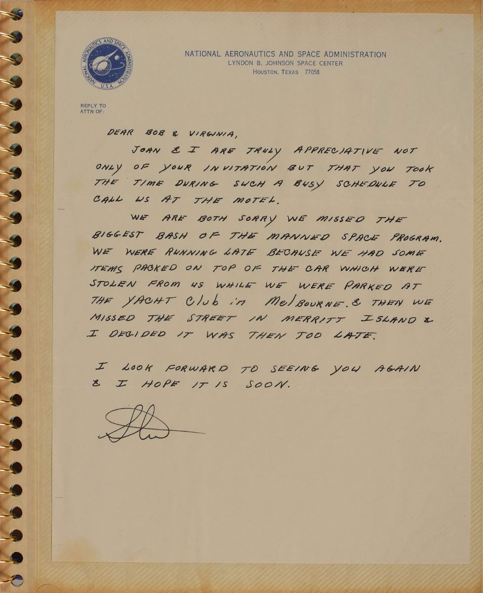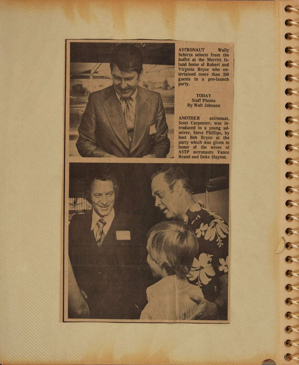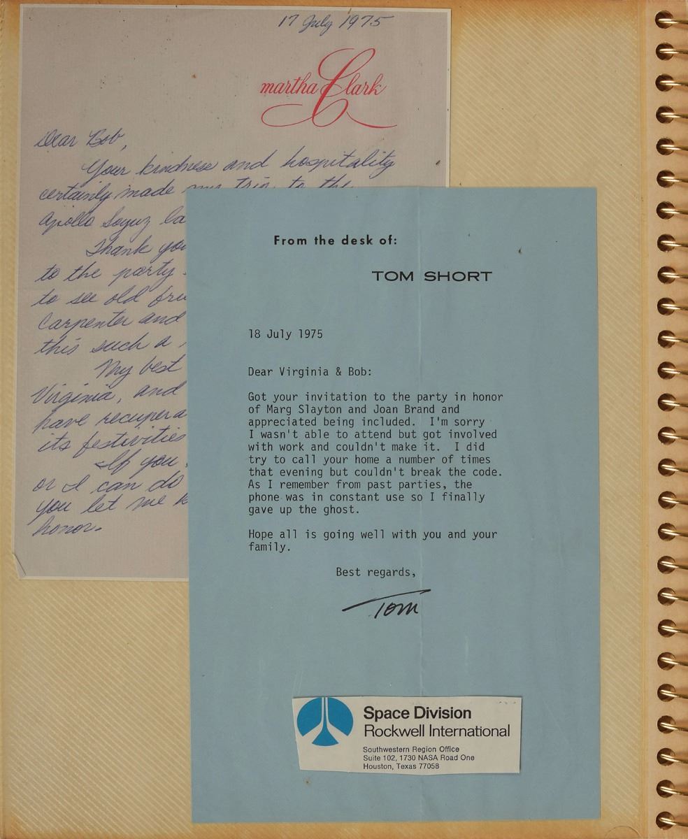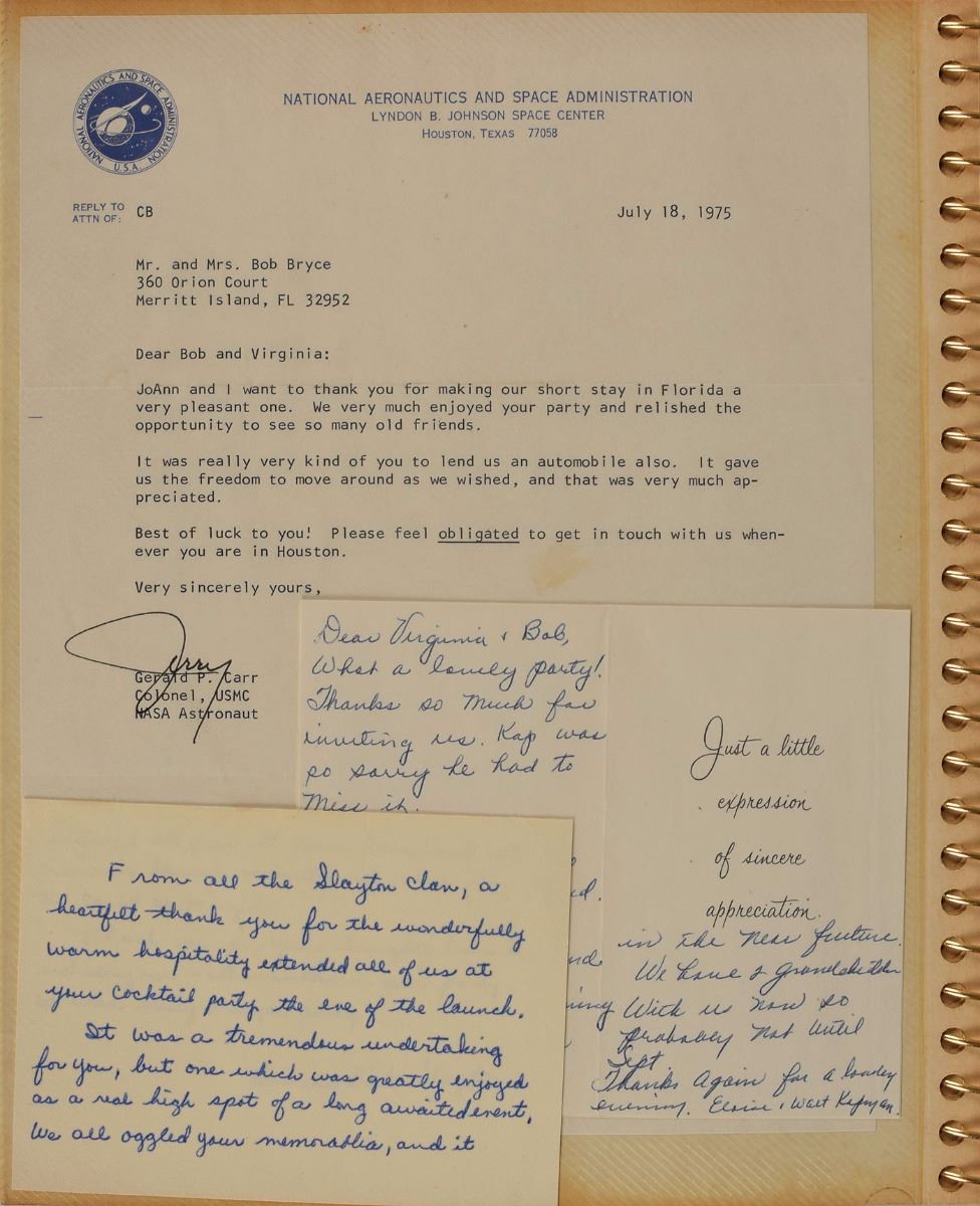 Guestbook from the Apollo-Soyuz launch party held by Mr. and Mrs. Bob Bryce on July 14, 1975, 7.5 x 6, signed inside by more than two hundred attendees, including astronauts Wally Schirra, James Lovell, Walt Cunningham, Bill Pogue, Hank Hartsfield, and Jerry Carr. Includes a photo album filled with related ephemera, including an invitation to the event, billing it as “Pre-Launch Cocktails in honour of Mrs. Deke Slayton and Mrs. Vance Brand,” newspaper clippings about the party, and a few thank-you notes sent to the couple, including a TLS by Jerry Carr and an ALS by Stu Roosa. In very good to fine condition. Pre-certified Zarelli Space Authentication.