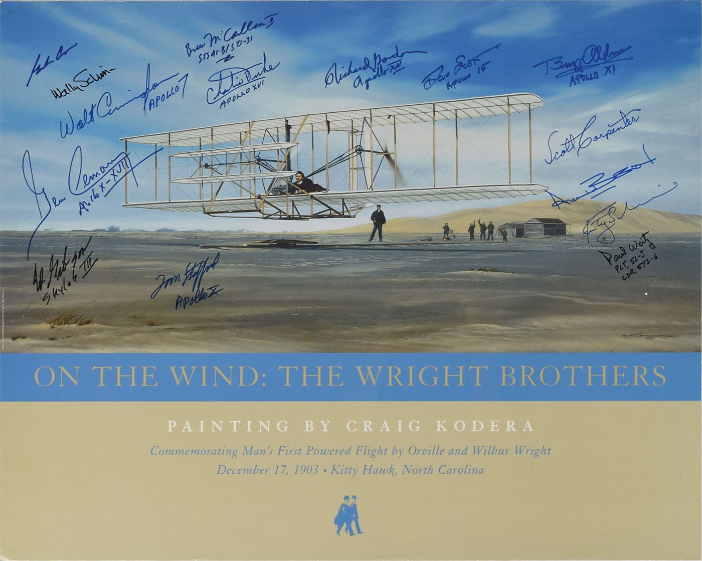Desirable color 27.75 x 22 poster entitled 'On the Wind: The Wright Brothers,' signed in blue and black felt tip by fifteen astronauts, many of whom add their missions. Signers are: Buzz Aldrin, Alan Bean, Charlie Duke, Dave Scott, Gene Cernan, Tom Stafford, Gordon Cooper, Wally Schirra, Walt Cunningham, Ed Gibson, Bruce McCandless, Dick Gordon, Scott Carpenter, Rusty Schweickert, and Paul Weitz. In fine condition, with light overall rippling, and a crease touching Cernan's signature. An attractive piece connecting man's first flight with the exploration of stars.
