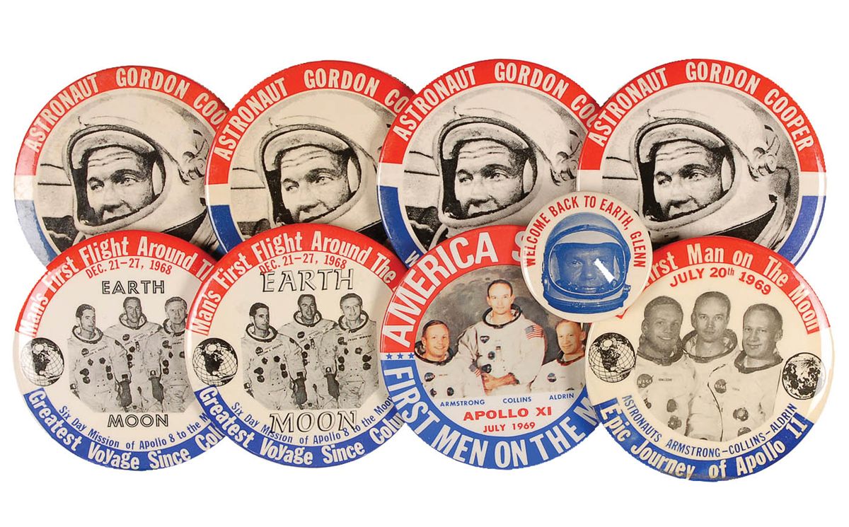 Collection of nine astronaut pins: a 1.75? diameter pin honoring John Glenn; four identical 3.5? pins honoring Gordon Cooper’s mission; two identical 3.5? pins commemorating the Apollo 8 mission; and two different 3.5? diameter pins honoring the Apollo 11 mission. In fine overall condition.