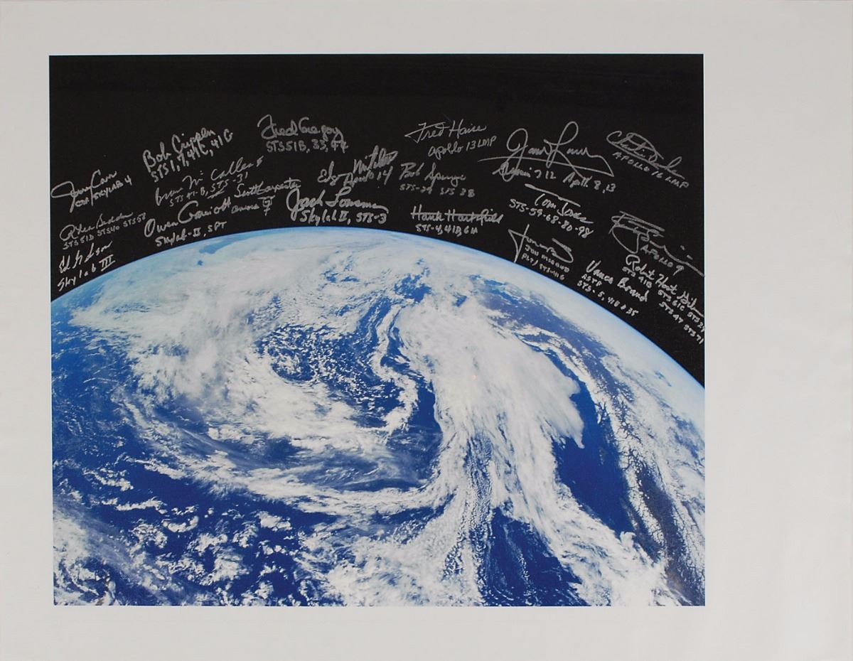 Wondrous color 31.25 x 24 canvas poster of a cloud-covered Earth, signed in silver ink by 20 astronauts, with each adding their missions, including: Scott Carpenter, Edgar Mitchell, Charlie Duke, James Lovell, Rusty Schweickart, Fred Haise, Bruce McCandless II, Owen Garriott, Jack Lousma, Hank Hartsfield, Vance Brand, Bob Crippen, Jerry Carr, Rhea Seddon, Ed Gibson, Fred Gregory, Bob Springer, Tom Jones, Jon McBride, and Robert ‘Hoot’ Gibson. Rolled and in fine condition. Originating from the Astronaut Scholarship Foundation, a portion of the proceeds for the sale of this item will be donated to the ASF.