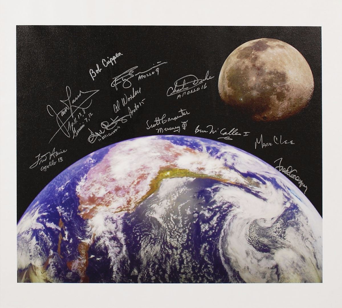 Extraordinary color 26.75 x 24 canvas print of the Earth and moon, signed in silver ink by eleven astronauts, with several adding their flight designations, including: Scott Carpenter, Charlie Duke, James Lovell, Rusty Schweickart, Fred Haise, Al Worden, Gene Kranz, Bob Crippen, Bruce McCandless II, Mark Lee, and Fred Gregory. Rolled and in fine condition. Originating from the Astronaut Scholarship Foundation, a portion of the proceeds for the sale of this item will be donated to the ASF.