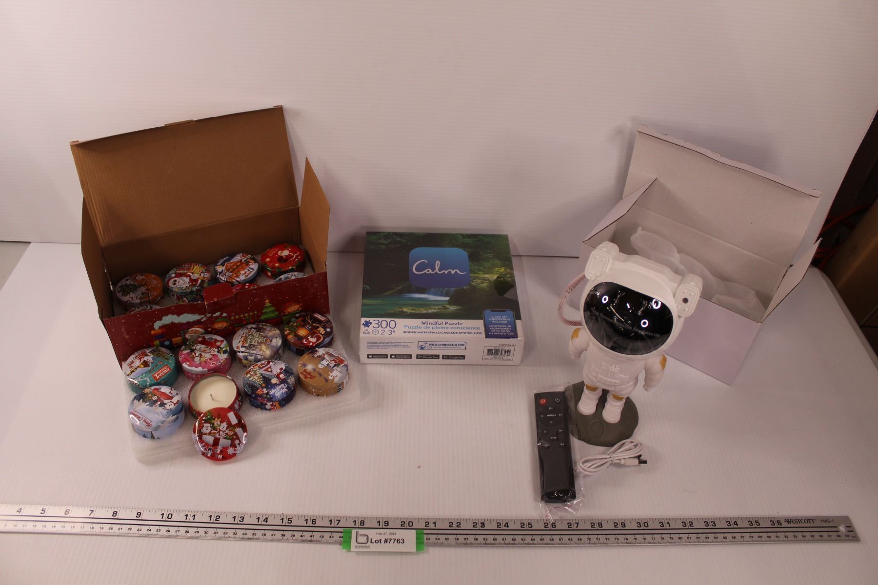 Astronaut Starry Sky Projector with Remote (New in Box), 300 pc. Mindful Puzzle CALM (NEW in Box), (16) Scented Christmas Candles (NEW in Box)