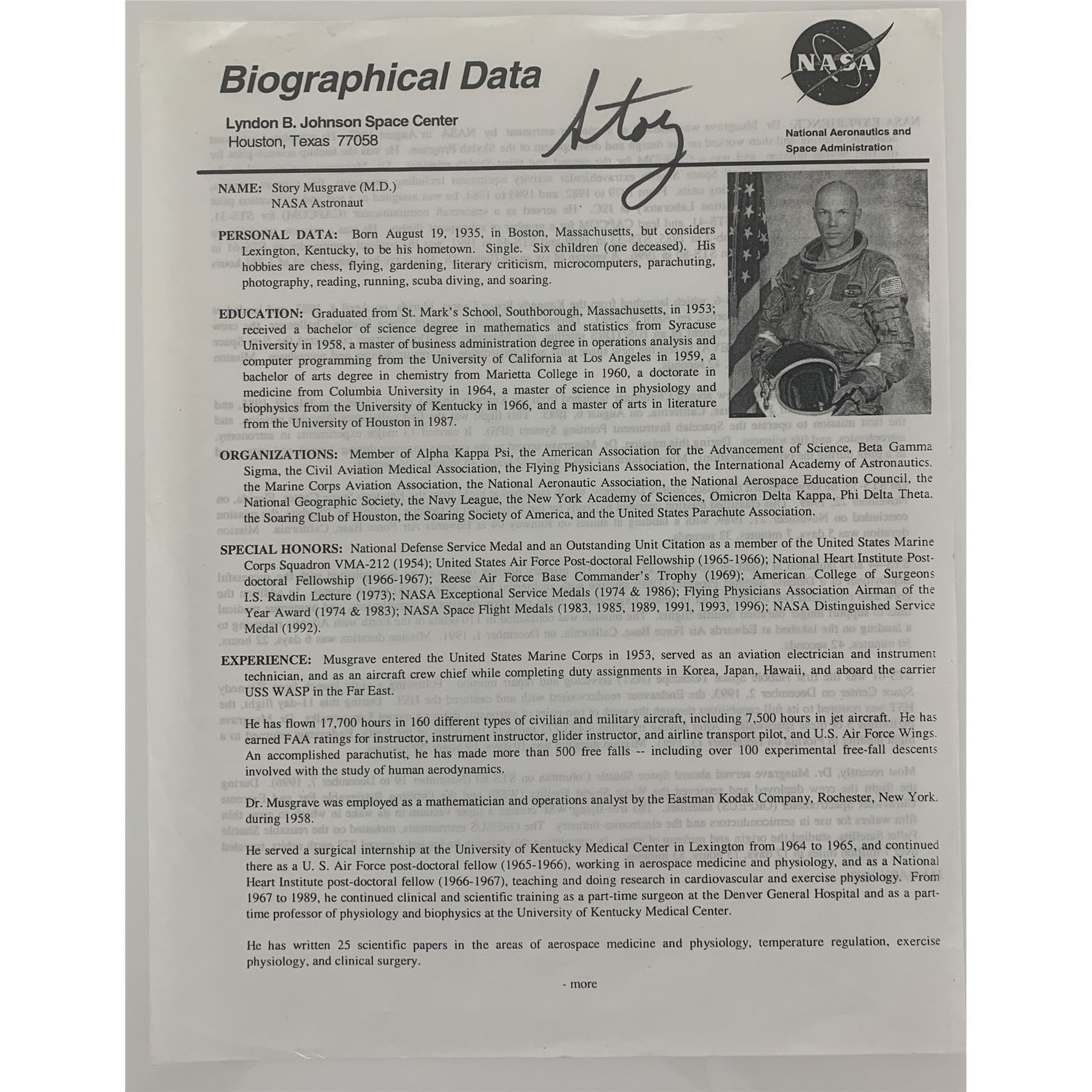 Astronaut Story Musgrave signed data sheet. 8.5x11 inches