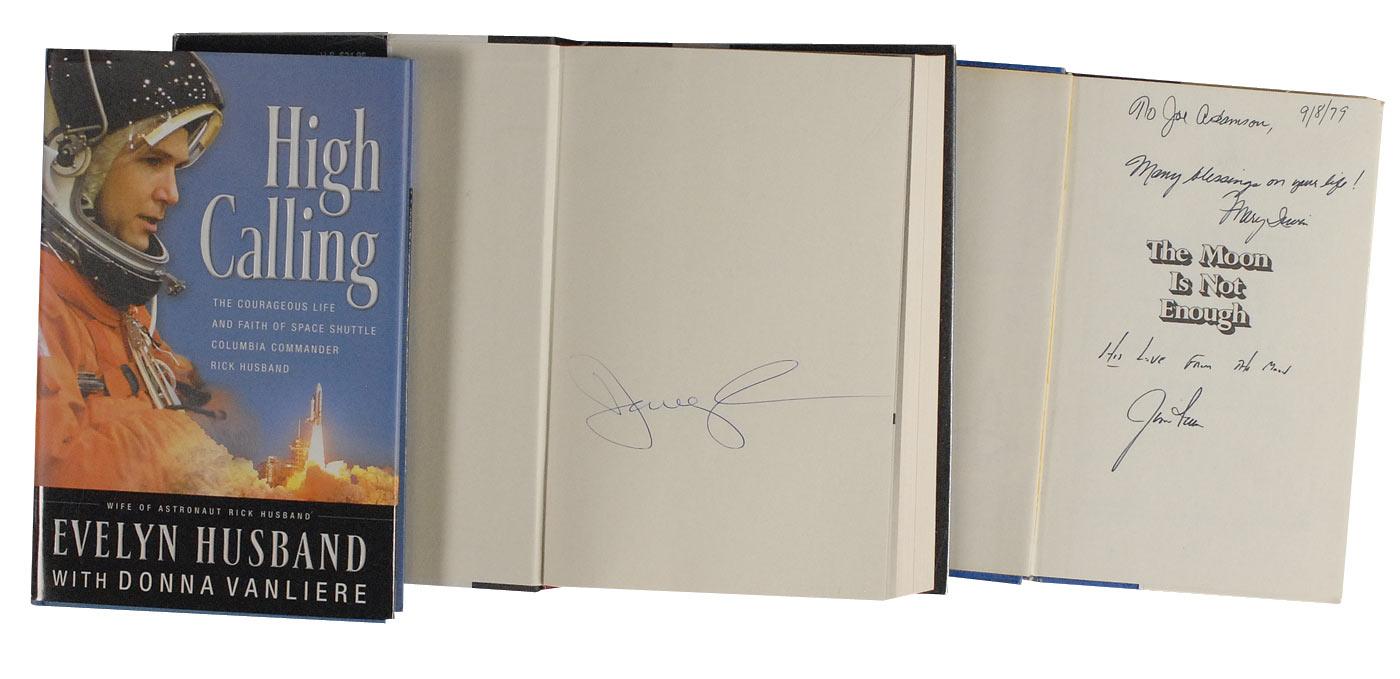 Three hardcover books: The Moon Is Not Enough, signed and inscribed on the half-title page by Jim and Mary Irwin; High Calling, signed by Evelyn Husband; and Rocket Man, signed on the first free end page by Nancy Conrad. In fine overall condition.