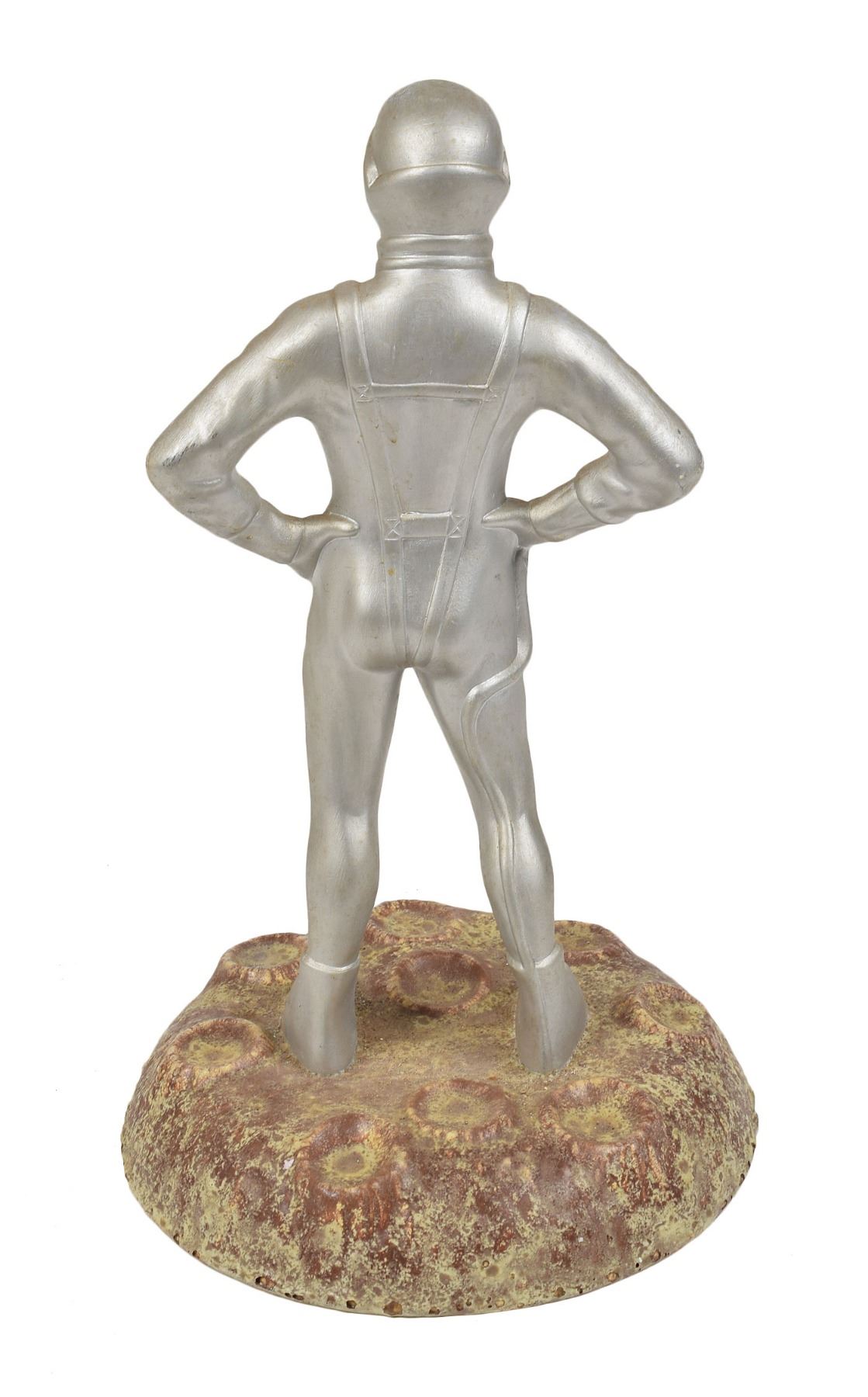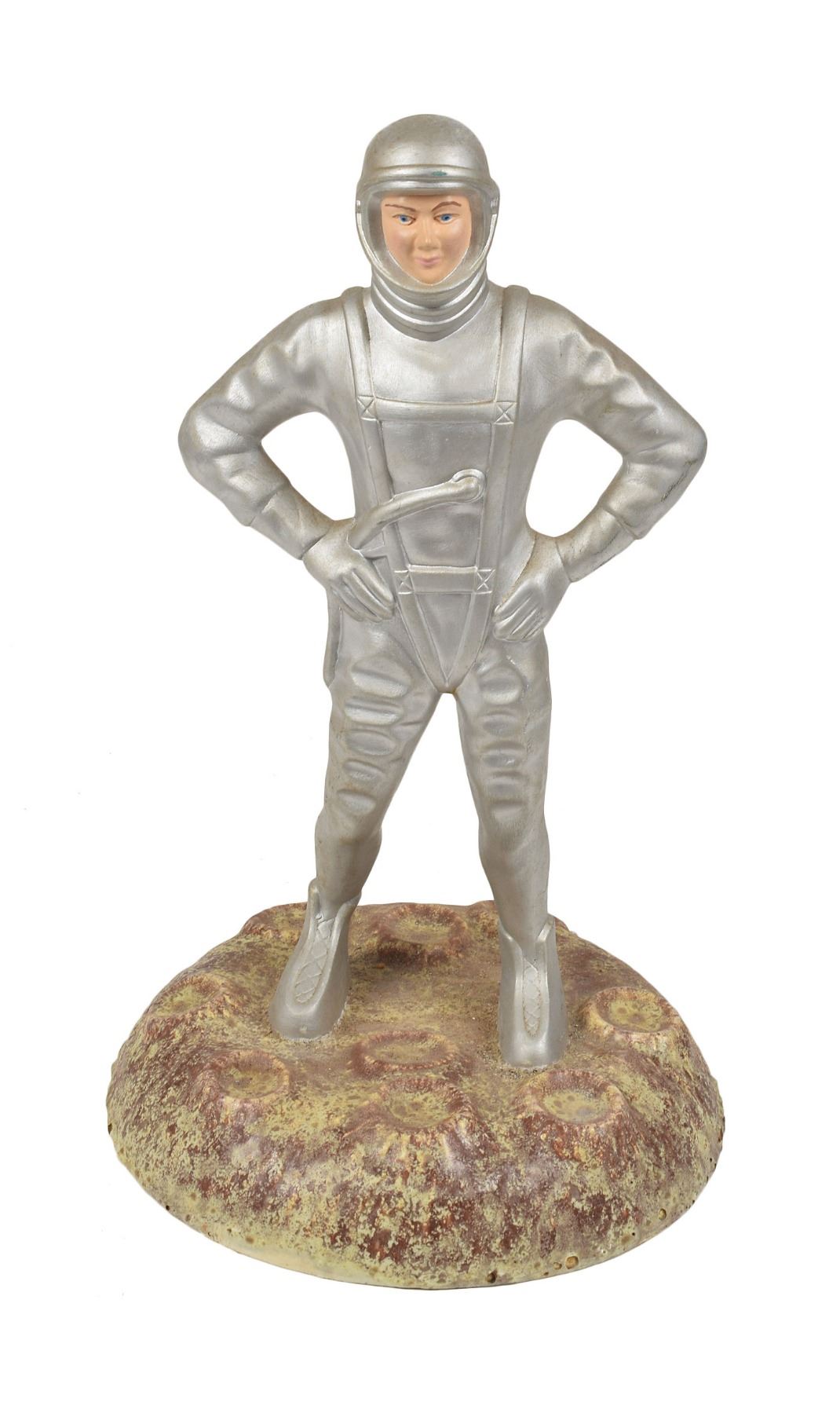Vintage circa early 1960s ceramic figurine portraying an astronaut standing on the cratered lunar surface, measuring 15.5? tall with a base diameter of 9?. In fine condition, with a couple tiny scuffs to paint. From the collection of aerospace memorabilia specialist Ken Havekotte.