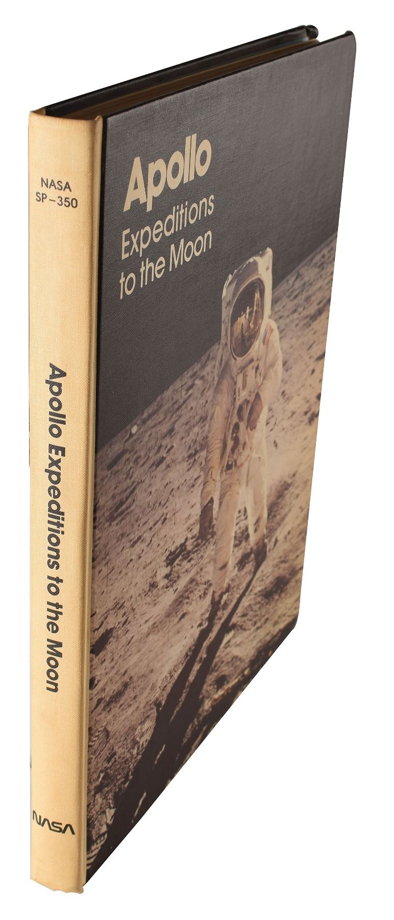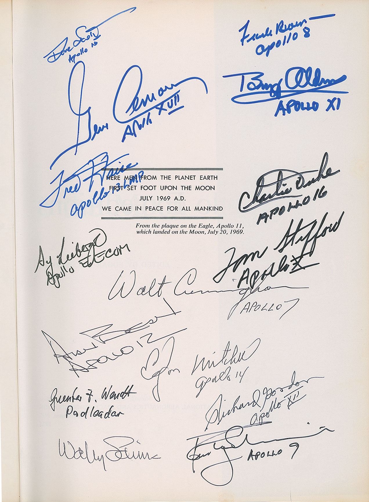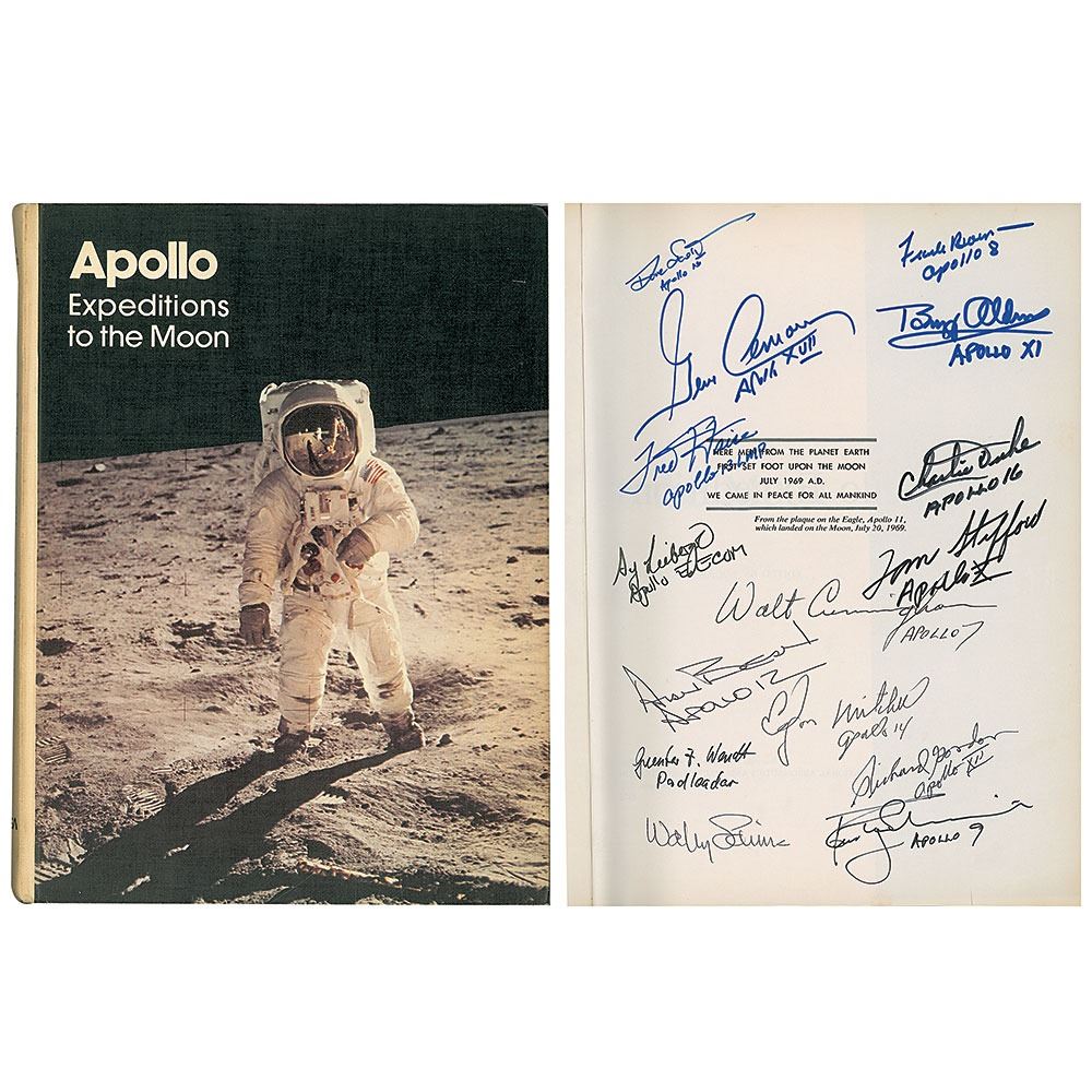 Signed book: Apollo Expeditions to the Moon. First edition. Washington, D.C.: NASA, 1975. Hardcover, 9.25 x 12, 313 pages. Signed on the opening 'Apollo plaque' page in ballpoint or felt tip by 13 legendary astronauts, including: "Dave Scott, Apollo 15," "Frank Borman, Apollo 8," "Gene Cernan, Apollo XVII," "Buzz Aldrin, Apollo XI," "Fred Haise, Apollo 13 LMP," "Charlie Duke, Apollo 16," "Tom Stafford, Apollo X," "Walt Cunningham, Apollo 7," "Alan Bean, Apollo 12," "Edgar Mitchell, Apollo 14," "Richard Gordon, Apollo XII," "Wally Schirra," and "Rusty Schweickart, Apollo 9." The page is also signed by MOCR Flight Controller EECOM Sy Liebergot and Pad Leader Guenter Wendt. In fine condition, with light toning to the spine.