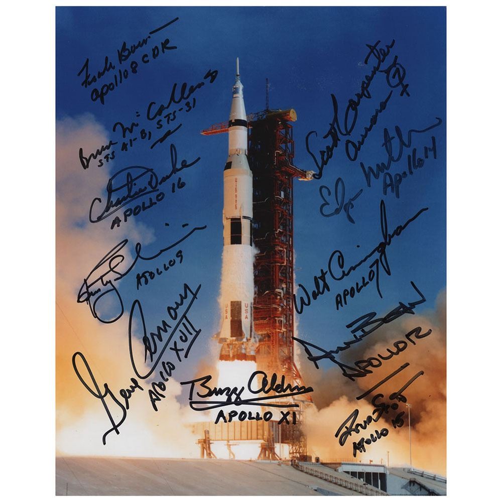 Color satin-finish 8 x 10 photo of a fiery Saturn rocket launch, signed in black felt tip by 11 astronauts: "Buzz Aldrin, Apollo XI," "Gene Cernan, Apollo XVII," "Dave Scott, Apollo 15," "Alan Bean, Apollo 12," "Edgar Mitchell, Apollo 14," "Charlie Duke, Apollo 16," "Scott Carpenter, Aurora 7," "Walt Cunningham, Apollo 7," "Frank Borman, Apollo 8 CDR," "Rusty Schweickart, Apollo 9," and "Bruce McCandless II, STS 41-B, STS-31." In fine condition, with an area of surface rubbing in the area of Carpenter's signature, visible only at an angle.