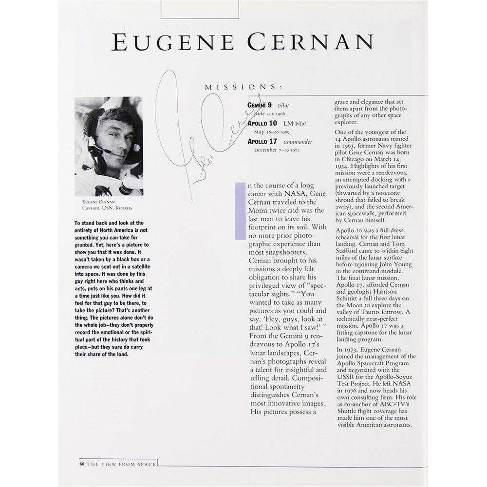 Signed book: The View from Space: American Astronaut Photography, 1962–1972. First edition. NY: Clarkson N. Potter, 1988. Hardcover with dust jacket, 10.25 x 13.25, 128 pages. Signed inside on separate pages in ink and felt tip by 12 astronauts: Buzz Aldrin, Wally Schirra, Gordon Cooper, Jim McDivitt, Tom Stafford, James Lovell, Gene Cernan, Richard Gordon, Walt Cunningham, Alan Bean, Al Worden, and Charlie Duke. In fine condition, with some light wear, and a short tear, to the dust jacket. Accompanied by certificates of authenticity from Novaspace for the Aldrin and Lovell autographs.