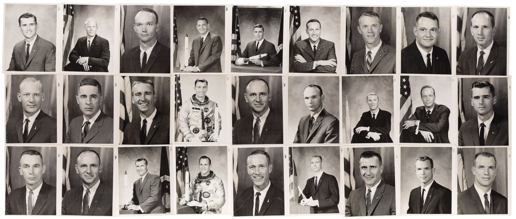 Impressive collection of 27 vintage official NASA portrait photographs of 16 legendary astronauts, all glossy 8 x 10 numbered examples, with each bearing NASA caption text on reverse. Astronauts include: Buzz Aldrin (2), Bill Anders (2), Alan Bean (2), Scott Carpenter, Gene Cernan, Roger Chaffee (2), Michael Collins (2), Walt Cunningham (2), Donn Eisele (2), Theodore Freeman, Richard Gordon (2), Rusty Schweickart (2), Dave Scott (2), Ed White II, Clifton Williams (2), and John Young. In overall very good to fine condition, with some slight curling and edgewear.