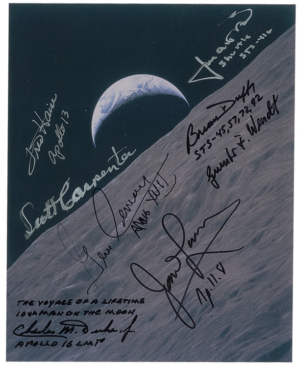 Color glossy 8 x 10 photo of the Earthrise taken from the moon, signed in black felt tip by James Lovell, Gene Cernan, Charlie Duke, Brian Duffy, and Guenter Wendt, and in silver ink by Scott Carpenter, Fred Haise, and John McBride. All but Carpenter and Wendt have added a mission notation. In fine condition with Carpenter retracing the start of his name.