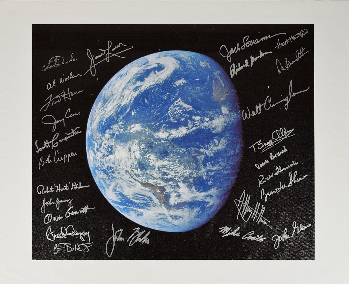 Beautiful color 29.5 x 24 canvas print of the Earth as viewed from space, signed in silver ink by 25 astronauts, including: Buzz Aldrin, John Young, John Glenn, James Lovell, Charlie Duke, Al Worden, Fred Haise, Walt Cunningham, Scott Carpenter, Richard Gordon, Jack Lousma, Jerry Carr, Bob Crippen, Robert 'Hoot' Gibson, Owen Garriott, Fred Gregory, Charles Frank Bolden, Jr., John Blaha, Hank Hartsfield, Dan Brandenstein, Vance Brand, Rick Hauck, Brewster Shaw, Jeffrey Hoffman, and Mike Coats. Rolled and in fine condition.