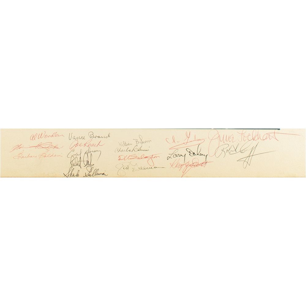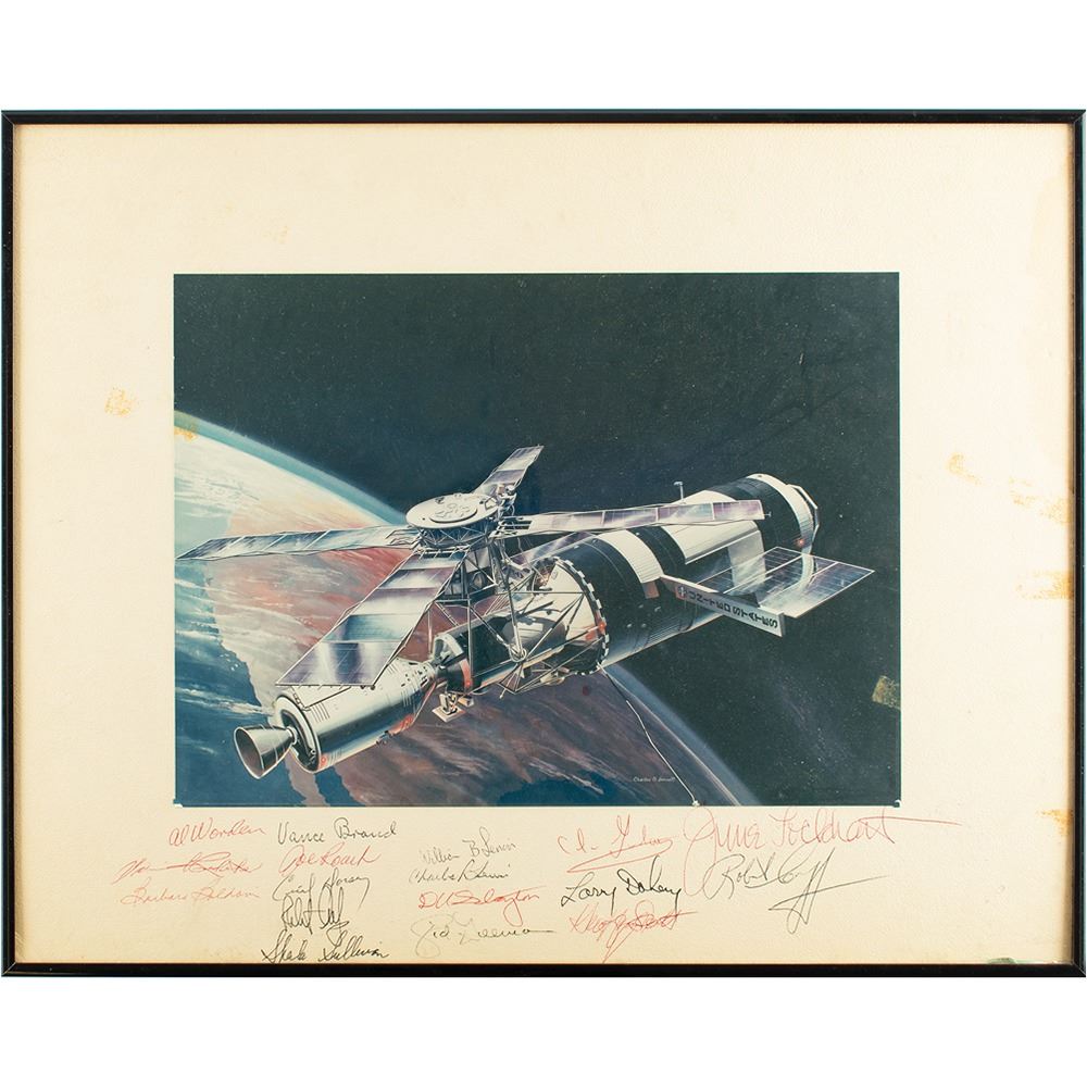 Appealing color semi-glossy 13.5 x 10 photo of a painting by Charles O. Bennett of the Skylab space station floating above Earth, affixed to it original 19.75 x 15.5 mount, signed on the mount in red and black ballpoint by 17 NASA astronauts and personnel, including: Al Worden, Vance Brand, Deke Slayton, William B. Lenoir, Cecil Dorsey, and more. Framed to a slightly larger size. In very good to fine condition, with staining to the mount.