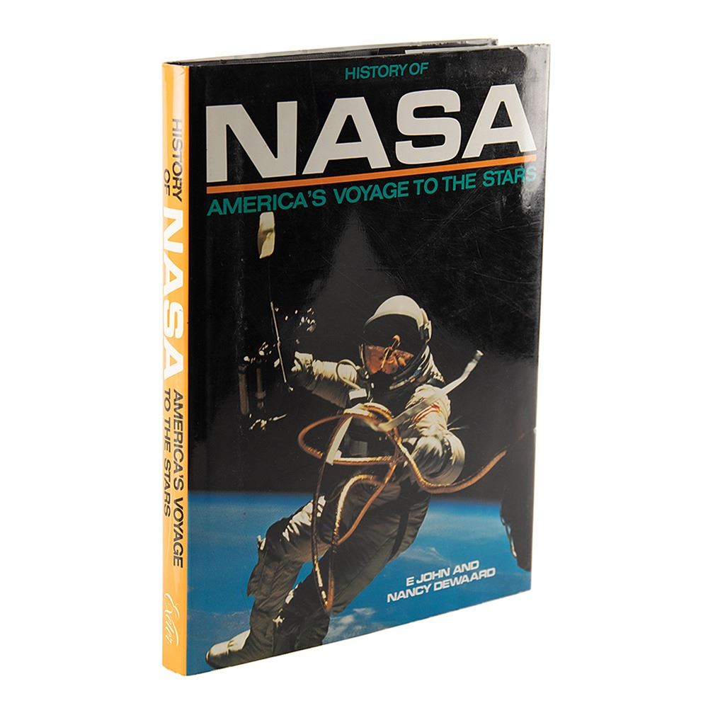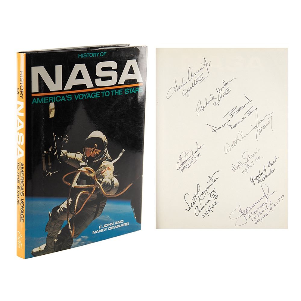 Signed book: History of NASA: America's Voyage to the Stars. Later printing. NY: Exeter Books, 1987. Hardcover with dust jacket, 9.25 x 12.25, 191 pages. Signed on the first free end page in black ballpoint and felt tip by seven astronauts, plus a cosmonaut and a NASA padleader: "Charles Conrad Jr., Apollo XII," "Richard Gordon, Apollo XII," "Alan Bean, Apollo XII," "Walt Cunningham, Apollo 7," "Wally Schirra, Apollo 7 Cdr.," "Charlie Duke, Apollo XVI," "Scott Carpenter, Aurora 7, 24/5/62," "Guenter F. Wendt, Padleader," and "Alexei Leonov, Voskhod-, Soyuz 19, ASTP." In fine condition, with a slight smudge to Cunningham's mission. A desirable assemblage of autographs, all enhanced by the addition of their role or mission.