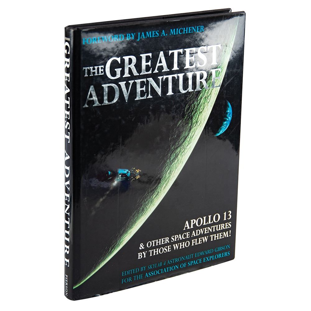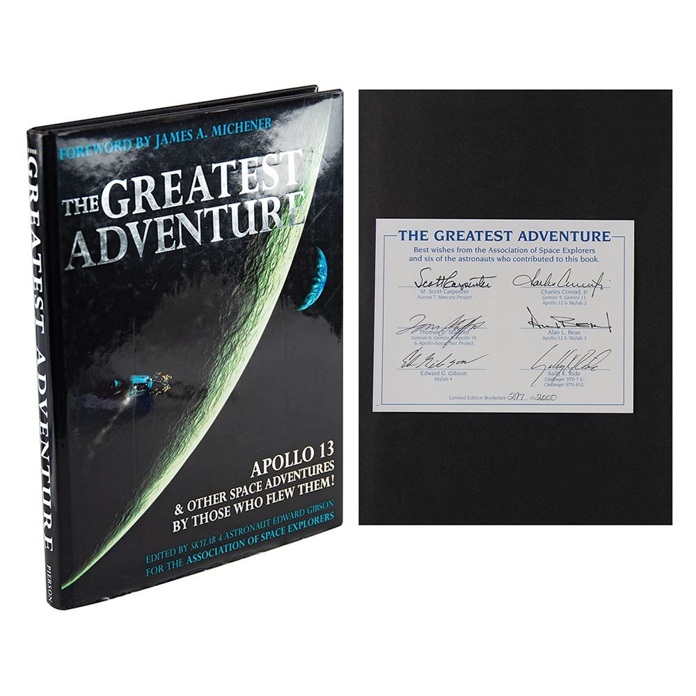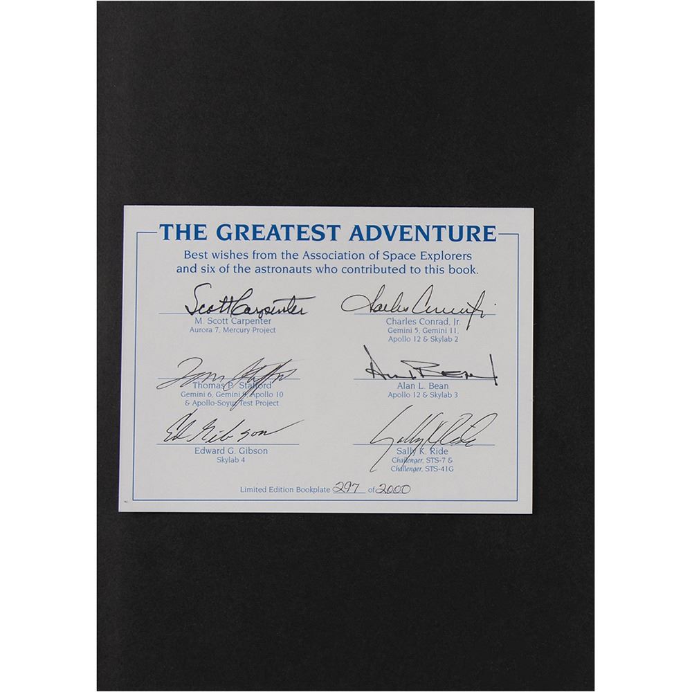 Signed book: The Greatest Adventure. Sydney, Australia: C. Pierson, 1994. Hardcover with dust jacket, 9.75 x 13, 224 pages. Signed in black ink on a limited edition bookplate (loosely laid-in), numbered 297/2000, by Scott Carpenter, Charles Conrad, Tom Stafford, Alan Bean, Ed Gibson, and Sally Ride. In fine condition