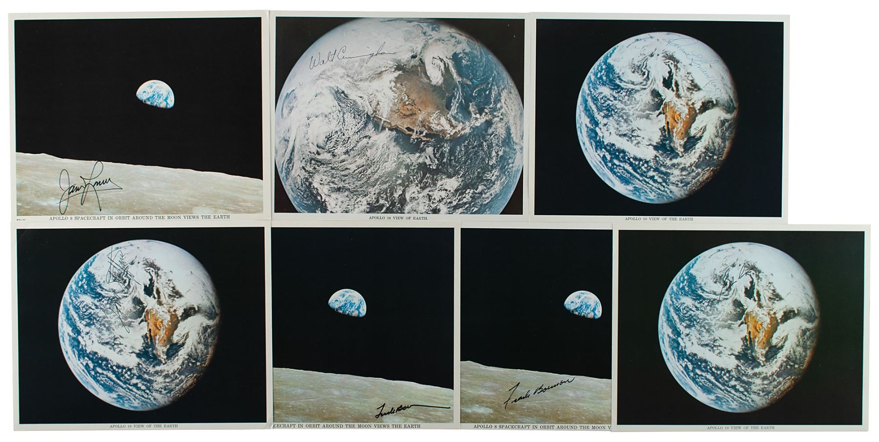 Attractive set of seven official NASA color 10 x 8 NASA lithographs of the Earth as viewed from space and the moon, each signed in ballpoint or felt tip by a NASA astronaut, including: Frank Borman (2), James Lovell, Walt Cunningham, Gordon Cooper, Tom Stafford, and Duane Graveline, who was the first astronaut to resign prior to being assigned a mission. In overall fine condition, with a small corner crease to the Stafford photo.