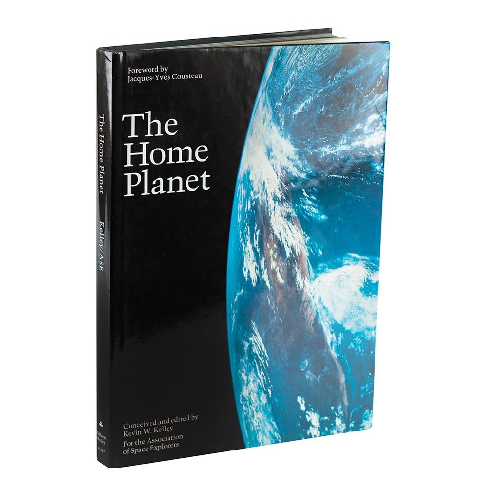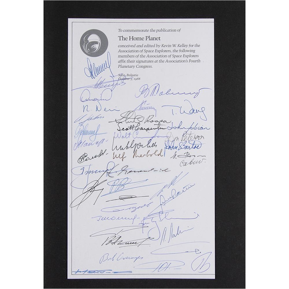 Signed book: The Home Planet. Reading, MA: Addison-Wesley, 1988. Hardcover with dust jacket, 10.25 x 14.25. Signed on a special bookplate affixed to the first free end page by the 39 members of the Association of Space Explorers in attendance at the fourth Planetary Congress, held in Sofia, Bulgaria on October 5, 1988, including: Scott Carpenter, Walt Cunningham, Stuart Roosa, Rusty Schweickart, Alexei Leonov, Gherman Titov, Vladimir Aksyonov, Aleksandr Aleksandrov, John-David Bartoe, Patrick Baudry, John Fabian, Mohammed Faris, Bertalan Farkas, Yuri Glazkov, Georgy Grechko, Jugderdemidiin Gurragchaa, Georgi Ivanov, Sigmund Jahn, Vladimir Kovalyonok, Aleksandr Laveykin, Oleg Makarov, Yuri Malyshev, Ulf Merbold, Ernst Messerschmid, Rodolfo Neri-Vela, Wubbo Ockels, Bob Overmyer, Donald Peterson, Dumitru Prunariu, Yuri Romanenko, Valery Rozhdestvensky, Nikolai Rukavishnikov, Svetlana Savitskaya, Vitaly Sevastyanov, Georgy Shonin, Anatoly Solovyev, Igor Volk, Taylor Wang, and Boris Yegorov. Additionally signed on the half-title page in black felt tip by Apollo 14 moonwalker Edgar Mitchell. In fine condition, with slight haloing to one of the lesser names. Accompanied by a signature identification key.