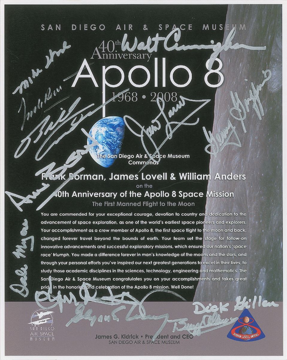 Color 8.5 x 10.75 cardstock program print for an event honoring the 40th anniversary of Apollo 8 at the San Diego Air & Space Museum, signed in silver ink by the complete Apollo 8 crew of Frank Borman, Bill Anders, and James Lovell, as well as Buzz Aldrin, Alan Bean, Walt Cunningham, Gene Kranz, Glynn S. Lunney, Gerry Griffin, Dale Myers, Dick Gillen, and one other. In fine condition. From the collection of Gene Kranz, who obtained these signatures in person as he was an invited guest. Accompanied by a letter of authenticity from Farthest Reaches.