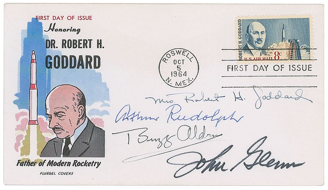 FDC with a cachet honoring the 'father of modern rocketry' Dr. Robert H. Goddard, signed in ink by moonwalker Buzz Aldrin, Mercury/Space Shuttle astronaut John Glenn, V-2 rocket engineer Arthur Rudolph, and Dr. Goddard's wife Esther. In very fine condition.