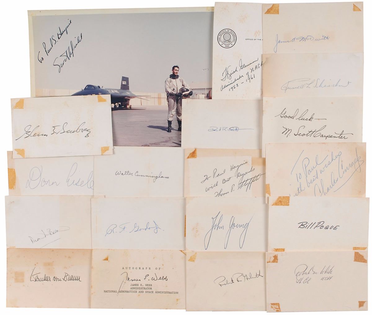Collection of nineteen items, primarily consisting of ink signatures on off-white cards, including: Wernher von Braun, John Young, Alan Bean, Dave Scott, Richard Gordon, James McDivitt, Rusty Schweickart, Scott Carpenter, Tom Stafford, Walt Cunningham, Donn Eisele, Charles Conrad, Glenn Seaborg, Bill Pogue, Robert White, Scott Crossfield (SP), James E. Webb, Robert R. Gilruth, and T. Keith Glennan. In overall very good condition, with scattered foxing and toning, and toned tape remnants to edges. Accompanied by an assortment of letters of transmittal and signatures of various administrators and engineers.