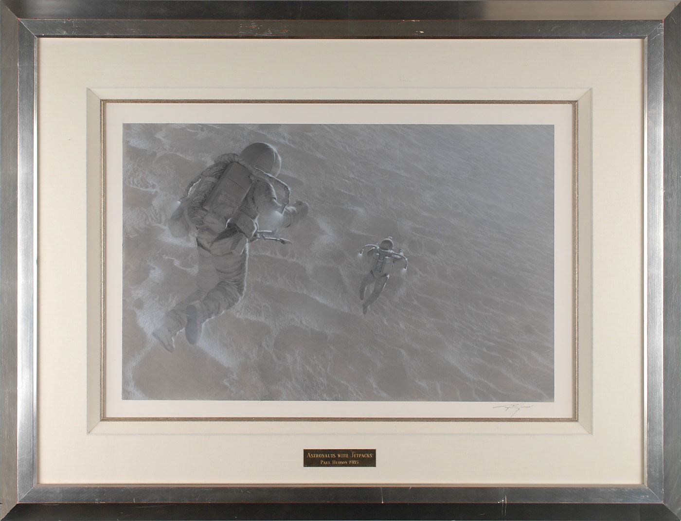 Striking color 26.25 x 17.5 print of Paul Hudson's 1985 work entitled 'Astronauts with Jetpacks,' showing two astronauts soaring over a desolate alien landscape. Signed in the lower border in black ballpoint by the artist. Cloth-matted and framed with an engraved plaque to an overall size of 38 x 29. In fine condition, with some abrasions and scuffs to the frame.