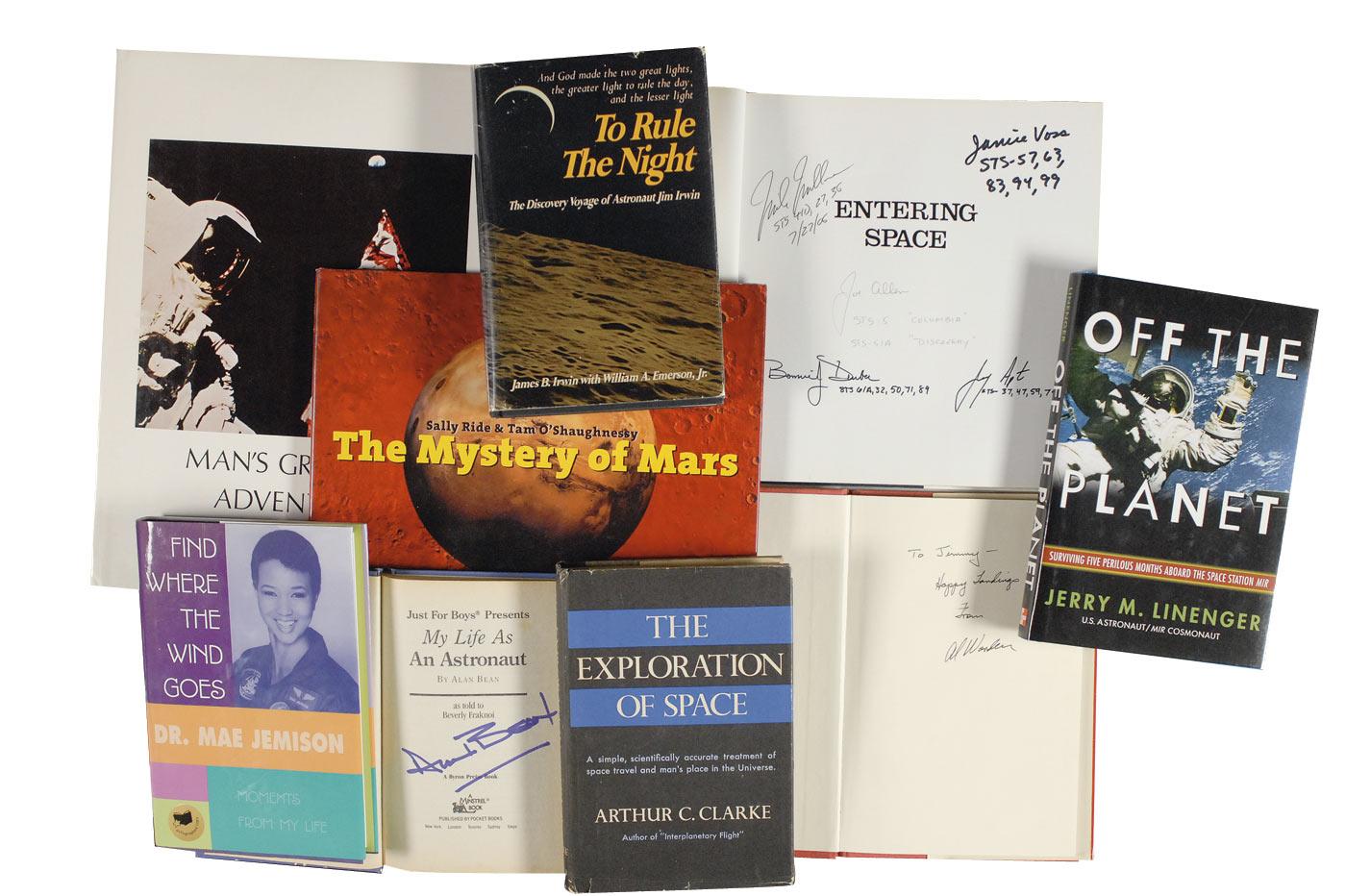 Nine hardcover books, each signed on an opening page by their respective astronaut author. Signers are: Man’s Greatest Adventure signed by seven including Alan Shepard, Mike Melville, Bonnie Dunbar, Janice Voss, The Mysteries of Mars signed by Sally Ride; The Exploration of Space signed by Bonnie Dunbar; Entering Space signed by five Shuttle astronauts; My Life As An Astronaut signed by Alan Bean; I Want To Know About A Flight To The Moon, signed and inscribed by Al Worden; To Rule The Night, signed and inscribed by Jim Irwin; Find Where The Wind Goes signed by Mae Jemison; and Off The Planet signed by Jerry M. Linenger. In fine overall condition.
