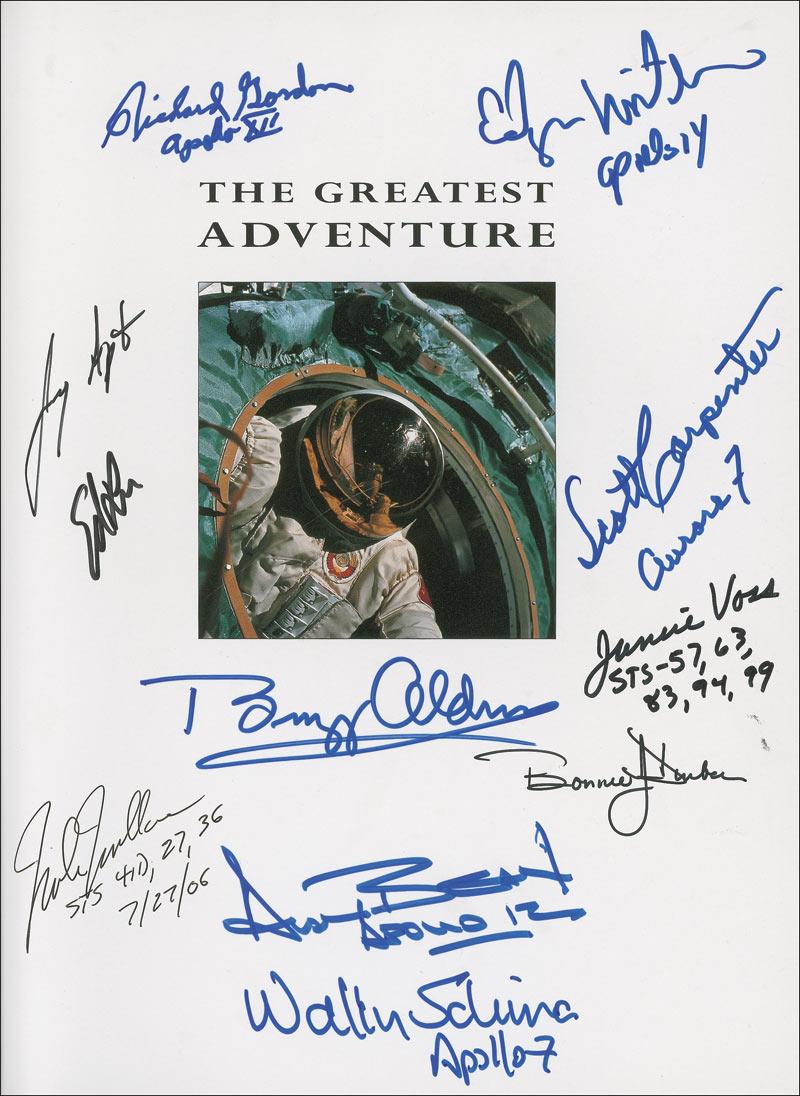 Signed book: The Greatest Adventure. Australia: C. Pierson, 1994. Hardcover with dustjacket, 9.75 x 13, 224 pages. Signed in felt tip on the half-title page by 11 astronuats including Buzz Aldrin, Alan Bean, Edgar Mitchell, Richard Gordon, Wally Schirra, Scott Carpenter, Jay Apt, Ed Lu, Mike Mullane, Bonnie Dunbar, and Janice Voss. In fine condition, with some light rubbing to covers as well as some mild wear to dustjacket.