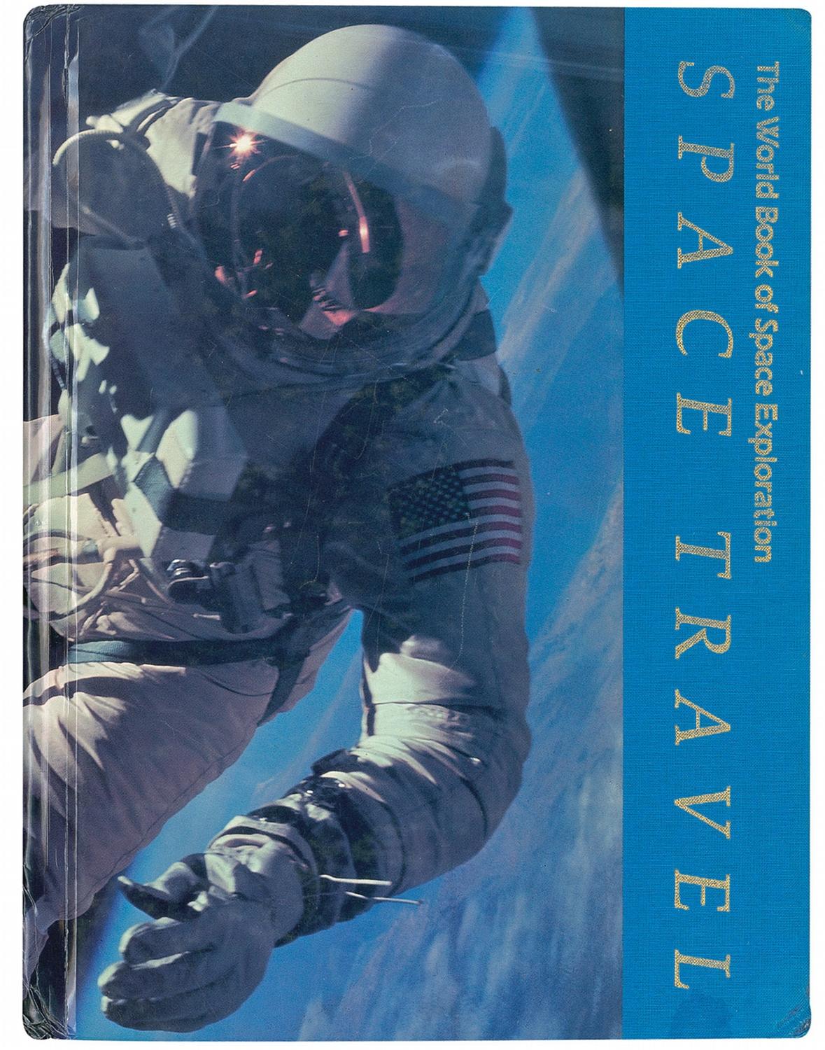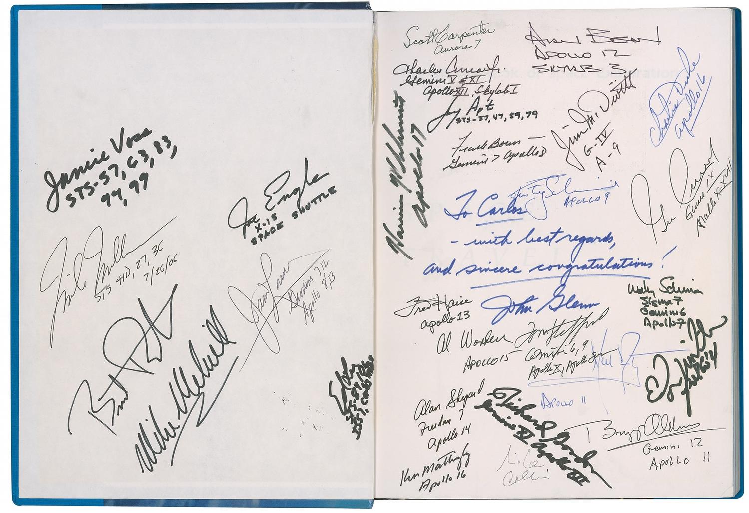 Signed book: Space Travel: The World Book of Space Exploration. Chicago: World Book Inc, 1990. Hardcover, 8.5 x 11, 256 pages. Signed on the first free end page in ink and felt tip by 22 astronauts including Neil Armstrong, adding “Apollo 11,” Buzz Aldrin, Michael Collins, John Glenn (ins), Alan Shepard, Gene Cernan, Charlie Duke, Ken Mattingly, Wally Schirra, Fred Haise, Edgar Mitchell, Frank Borman, Charles Conrad, Alan Bean, Rusty Schweickart, Tom Stafford, Harrison H. Schmitt, Scott Carpenter, Ken Mattingly, Jay Apt, Richard Gordon, and Al Worden; and signed in ink and felt tip on the inside front cover by James Lovell, Joe Engle, Ed Lu, Mike Mellville, Mike Mullane, Janice Voss, and Burt Ratan; most of the signers have added their various missions. In fine condition, with some light rubbing to the covers and a bump to the bottom of the spine. A fabulous array of over two dozen astronauts, including nine moonwalkers and the entire Apollo 11 crew.