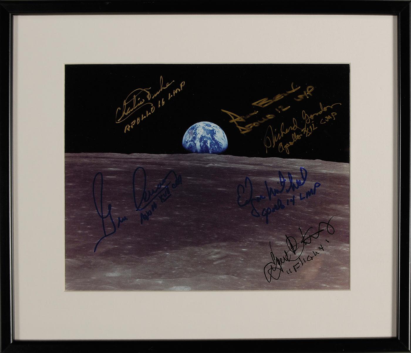 Color satin-finish 10 x 8 photo of the earth rising over the lunar horizon, signed in gold ink by Charlie Duke, Alan Bean, and Richard Gordon and in blue felt tip by Gene Cernan and Edgar Mitchell. All five astronauts have also added their mission assignments. Also signed in black felt tip by Gene Kranz. Matted and framed to an overall size of 14 x 11. In fine condition.