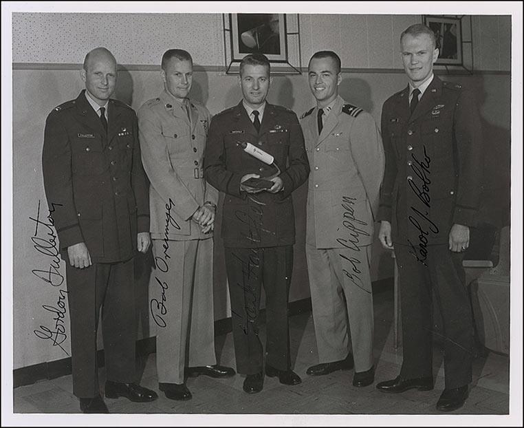 Glossy 10 x 8 Air Force photo of the Manned Orbiting Laboratory Pilots, signed vertically in black ink by all five: Gordon Fullerton, Bob Overmyer, Henry Hartsfield, Bob Crippen, and Karol Bobko. In fine condition, with light contrast to Hartsfield’s signature.