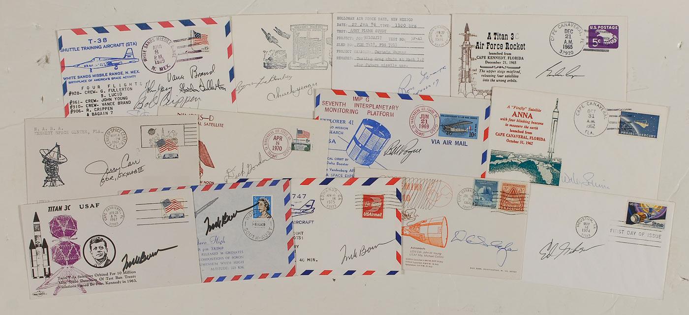 Thirteen items consisting of twelve commemorative covers and one First Day Cover, signed by 16 astronauts in felt tip and ballpoint. Signers are: John Young, Vance Brand, Gordon Fullerton, Bob Crippen, Ron Evans, Gordon Cooper, Jerry Carr, Dick Gordon, Bill Pogue, Chuck Yeager and Byron Lichtenberg, Wally Schirra, Frank Borman (3), Shannon Lucid, Deke Slayton, and Ed Gibson. In overall fine condition, with light corner creasing.