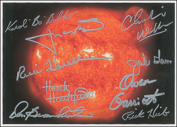 Color 5.75 x 4 postcard photo of a full sun image from EIT, signed in silver ink by nine Skylab and shuttle astronauts including Karol Bobko, Owen Garriott, Rick Hieb, Jake Garn, and Rick Hauck. In fine condition, with some light irregular adhesion to a couple of the signatures.