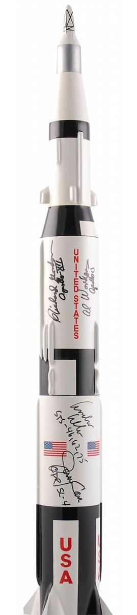 Composite 1/200 scale model of a Saturn V rocket, 20.5? in height, presented on a wooden base, and signed on the sides in black felt tip by 11. Signers include: Edgar Mitchell, Jerry Carr, Andrew Allen, Al Worden, Richard Gordon, Walt Cunningham, Scott Carpenter, Mike Mullane, Joe Kerwin, Laura Shepard (daughter of Alan Shepard), and one other. In fine condition, with some light yellowing to panels.