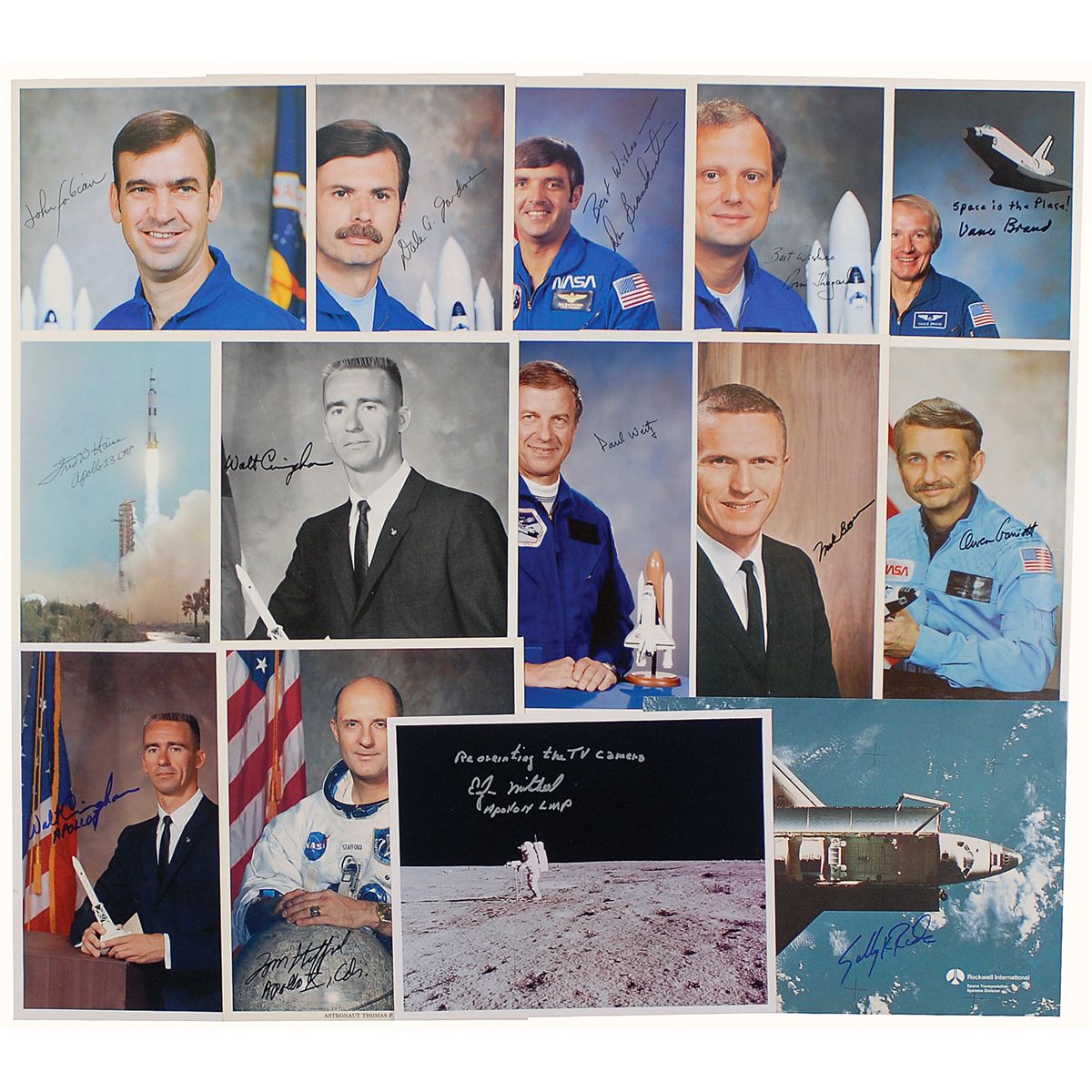 Fourteen signed photos, various finishes, both 8 x 10 and 10 x 8, each signed in felt tip by the respective astronaut pictured. Signers are: Edgar Mitchell, Frank Borman, Tom Stafford, Fred Haise, Walt Cunningham (2), Sally Ride, Vance Brand, Daniel Brandenstein, John Fabian, Dale Gardner, Owen Garriott, Norman Thagard, and Paul Weitz. In fine condition.