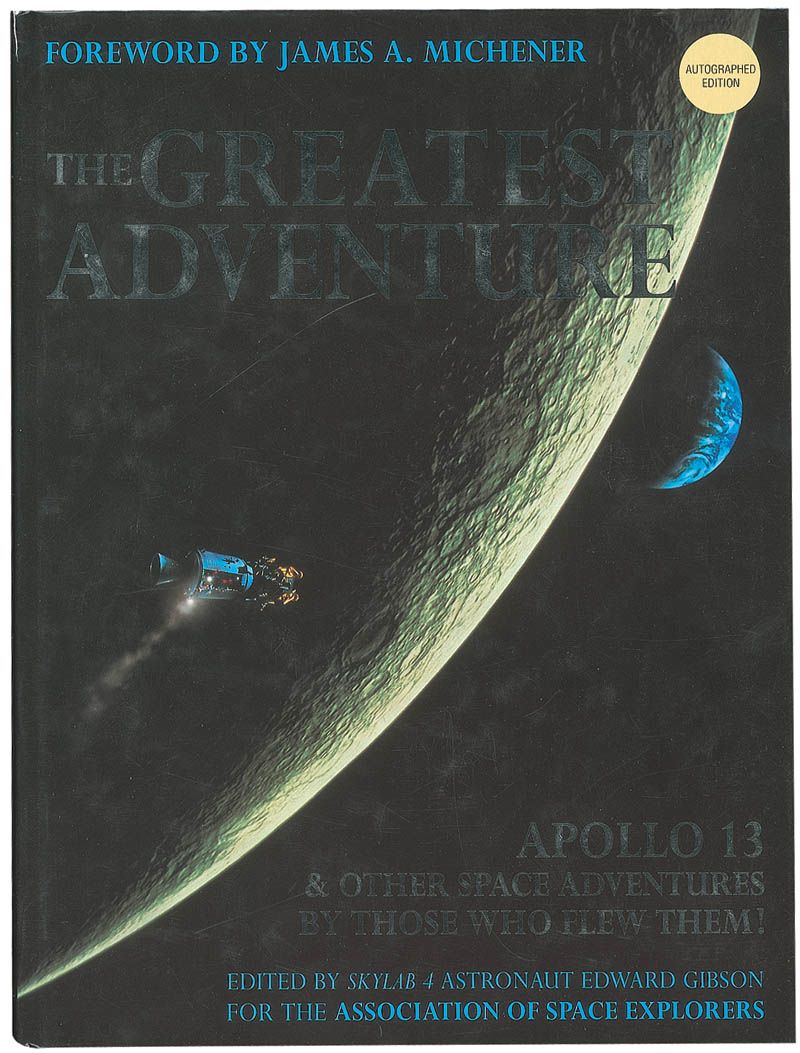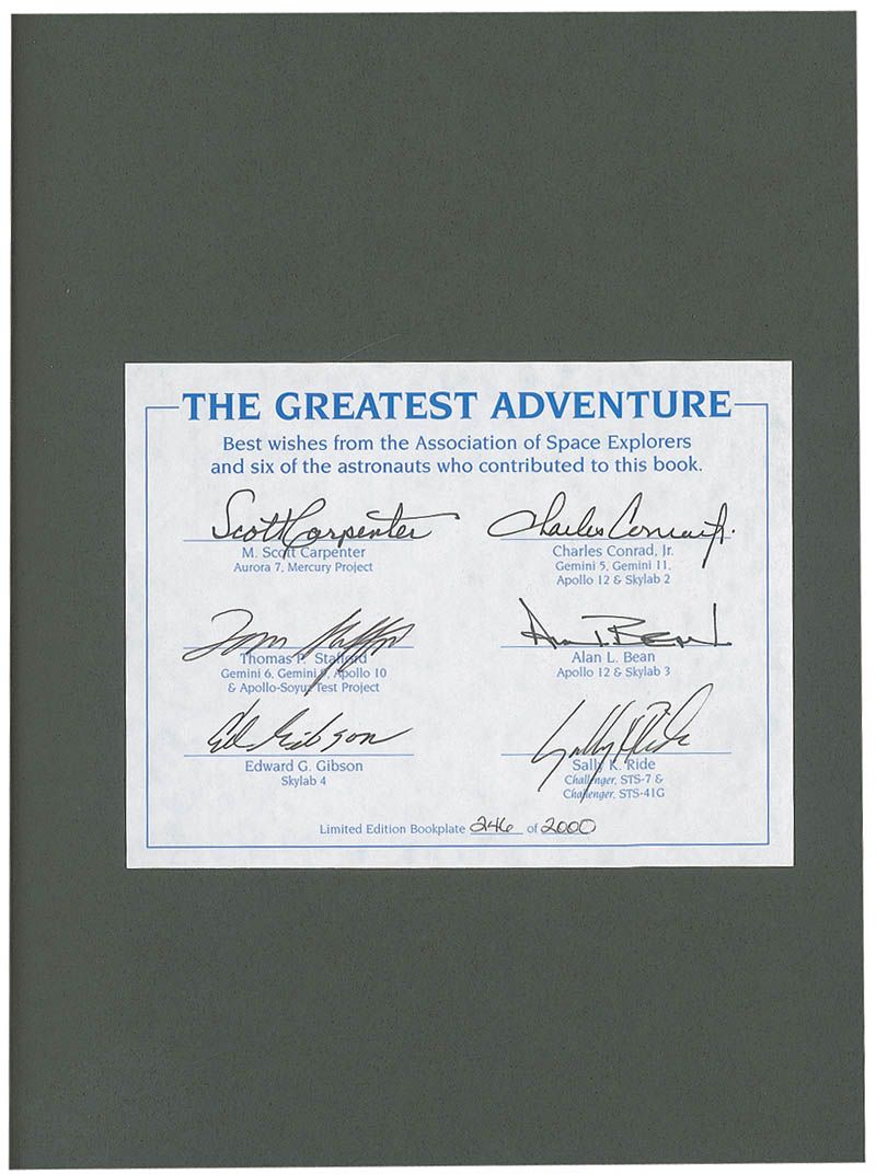 Signed book: The Greatest Adventure. Later printing. Australia: C. Pierson, 1994. Hardcover with dustjacket, 9.75 x 13, 224 pages. Signed on a limited edition bookplate affixed to the first free end page, #246/2000, by Scott Carpenter, Charles Conrad, Tom Stafford, Alan Bean, Ed Gibson, and Sally Ride. In fine condition.