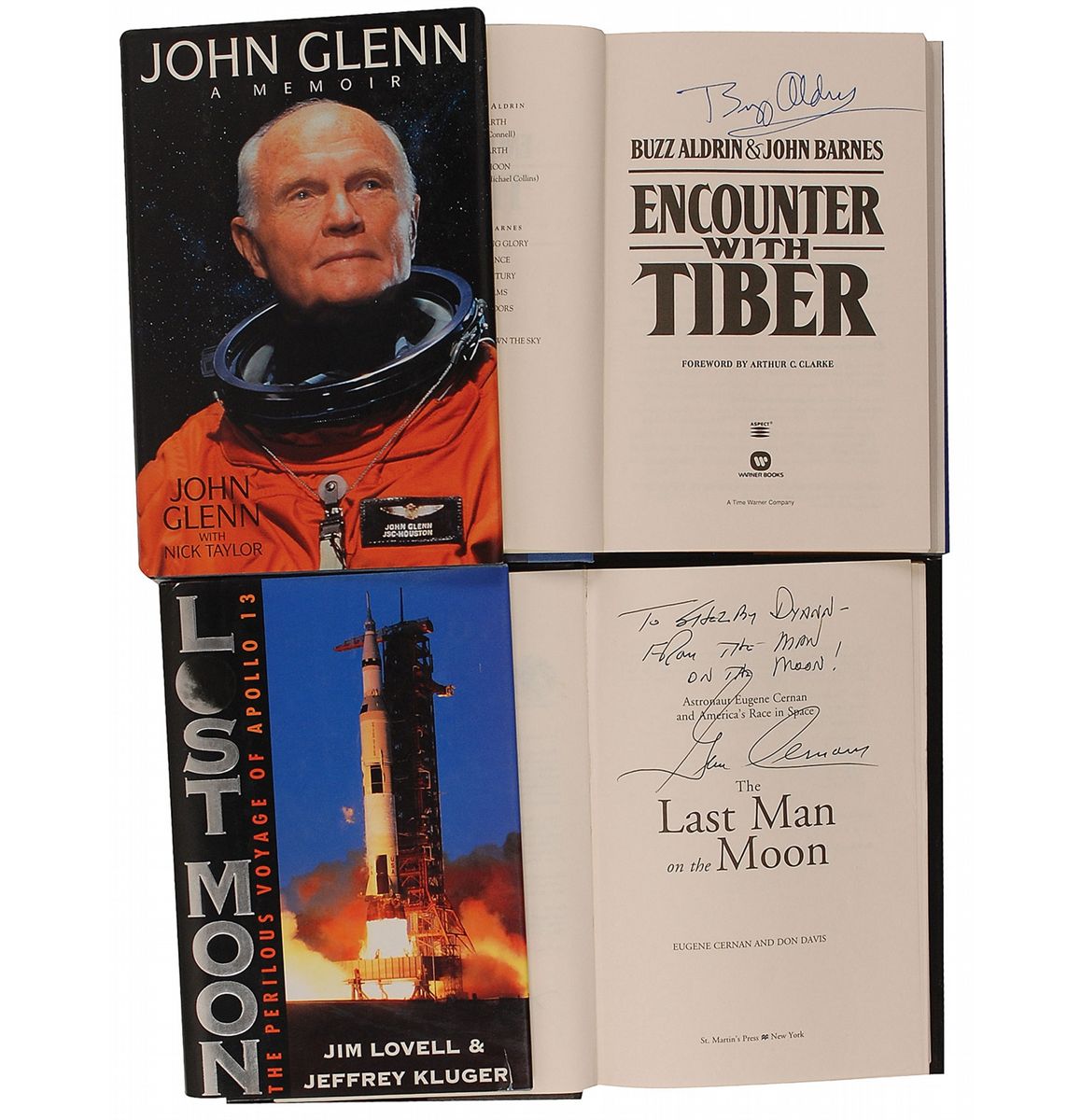 Four hardcover books: Encounter with Tiber, signed on the title page by Buzz Aldrin; The Last Man on the Moon, signed and inscribed on the title page by Gene Cernan; Lost Moon, signed on the title page by James Lovell; and John Glenn, A Memoir, signed and inscribed on the half-title page by Glenn. In overall fine condition, with scattered wear to dust jackets.