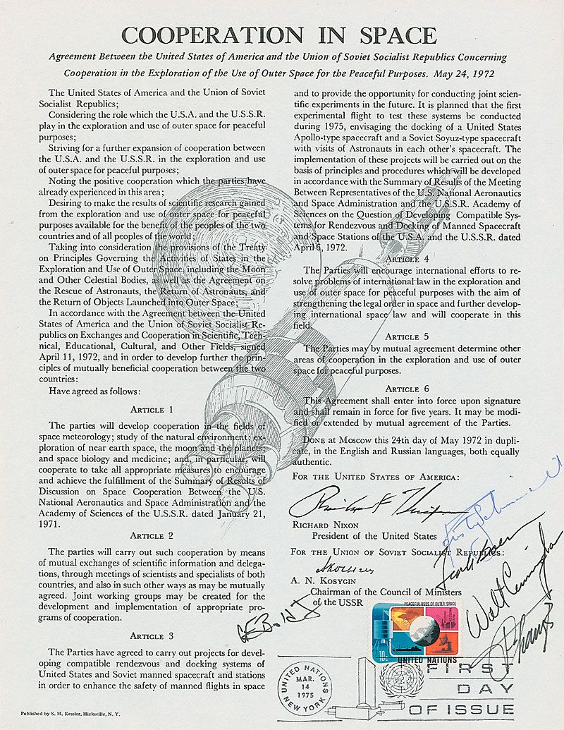 Souvenir typescript of the ‘Cooperation in Space’ agreement between the United States and Soviet Union bearing a first day cancellation, one page, 8.5 x 11, signed in the lower right in felt tip and ballpoint by Frank Borman, Rusty Schweickart, Walt Cunningham, Charles Bolden, and Franklin Chang-Diaz. In fine condition.