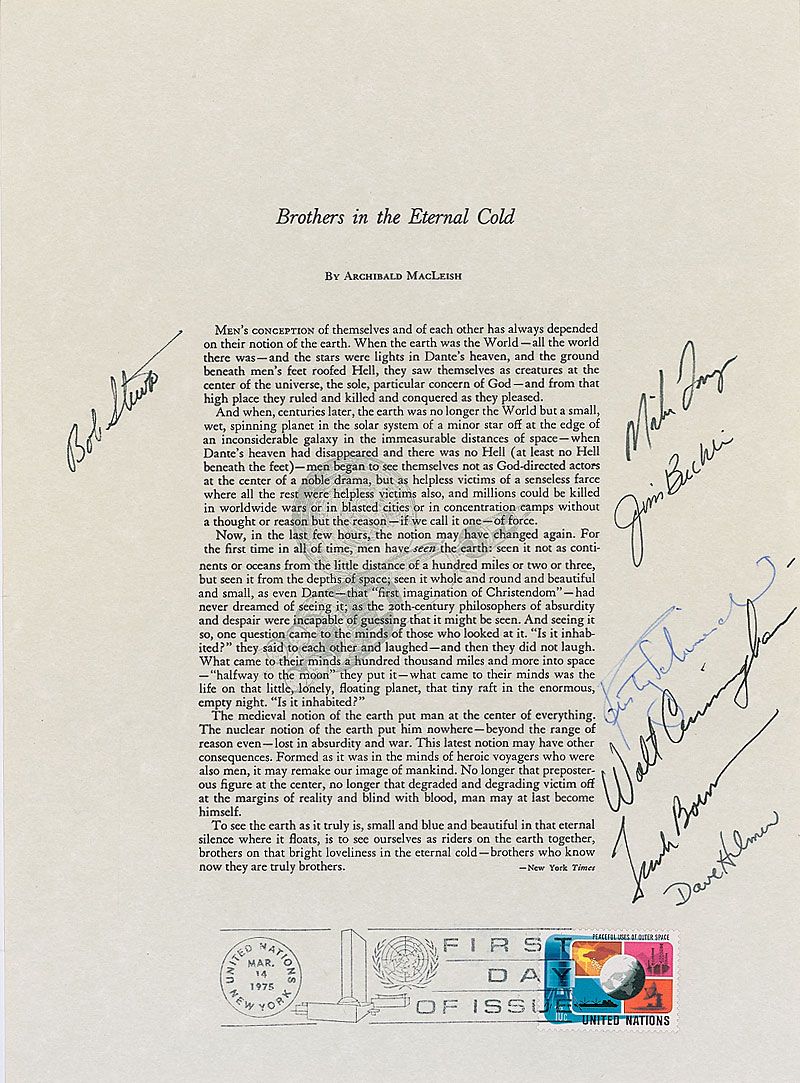 Souvenir typescript of ‘Brothers in the Eternal Cold’ bearing a first day cancellation, one page, 8 x 11, signed in felt tip and ballpoint by Frank Borman, Rusty Schweickart, Walt Cunningham, Bob Stewart, Dave Hilmers, James Buchli, and Mike Lounge. In fine condition.