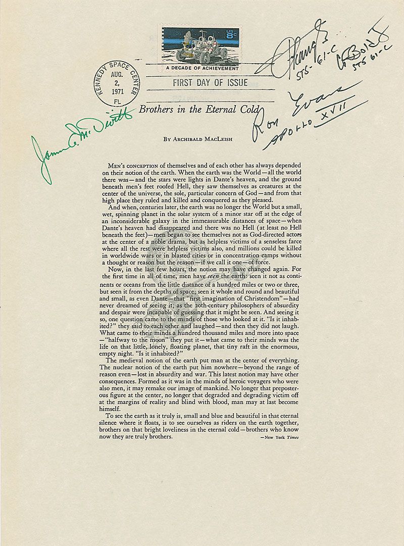 Souvenir typescript of ‘Brothers in the Eternal Cold’ bearing a first day cancellation, one page, 8 x 11, signed at the top in black and green felt tip by Jim McDivitt, Ron Evans, Charles Bolden, and Franklin Chang-Diaz. In fine condition.