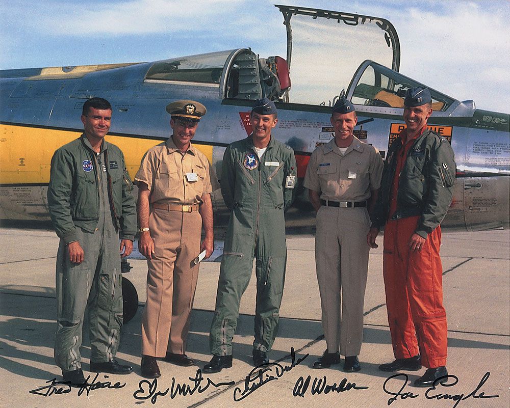 Color glossy 10 x 8 photo of five of the Group 5 astronauts assigned to Edwards AFB after their selection to NASA, standing in front of an F-104 at Edwards Air Force Base, signed in black felt tip by Fred Haise, Edgar Mitchell, Charlie Duke, Al Worden, and Joe Engle. In very fine condition.