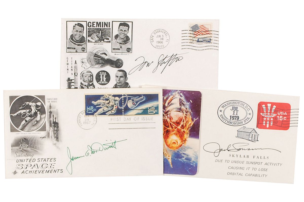 Three commemorative covers with various cachets, individually signed in ink by Tom Stafford, James McDivitt, and Jack Lousma. In overall fine condition.