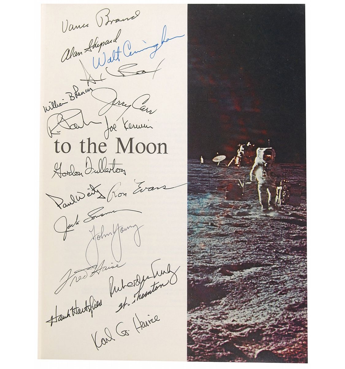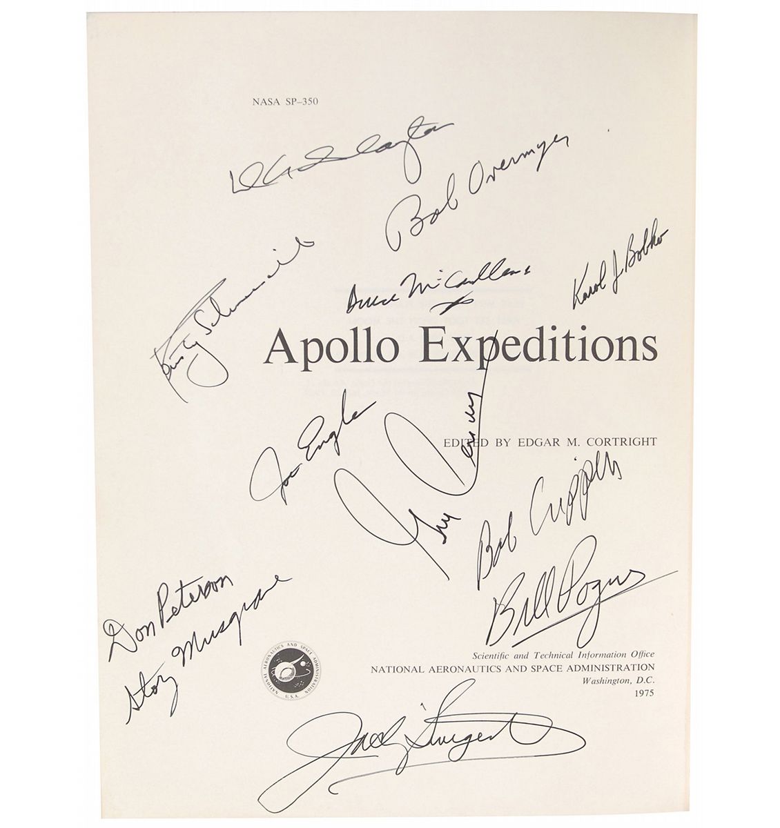 Signed book: Apollo Expeditions to the Moon. First edition. Washington, DC: NASA, 1975. Hardcover, 9 x 12, 313 pages. Signed on the title pages in blue and black felt tip by 30 astronauts. Signers are: Alan Bean, Krol J. Bobko, Vance Brand, Jerry Carr, Gene Cernan, Bob Crippen, Walt Cunningham, Joe Engle, Ron Evans, Gordon Fullerton, Fred Haise, Hank Hartfield, Karl G. Henize, Joe Kerwin, William B. Lenoir, Jack Lousma, Bruce McCandless, Story Musgrave, Bob Overmeyer, Robert A. Parker, Don Peterson, Bill Pogue, Rusty Schweickart, Alan Shepard, Deke Slayton, Jack Swigert, William Thornton, Richard Truly, Paul Weitz, and John Young. In fine condition.