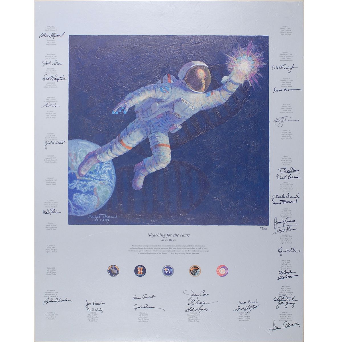 Limited edition color 27 x 34 textured canvas print entitled ‘Reaching for the Stars’ by Alan Bean, numbered 823/1500, stretched over a wooden frame, signed in black felt tip by 31 astronauts from the Mercury, Gemini, Apollo, and Skylab programs. Signers are: Alan Shepard, John Glenn, Scott Carpenter, Gordon Cooper, Wally Schirra, Jim McDivitt, Richard Gordon, Walt Cunningham, Frank Borman, Rusty Schweikart, Buzz Aldrin, Michael Collins, Charles Conrad, Alan Bean, James Lovell, Fred Haise, Edgar Mitchell, Al Worden, Dave Scott, Charlie Duke, John Young, Gene Cernan, Joe Kerwin, Paul Weitz, Owen Garriott, Jack Lousma, Jerry Carr, Ed Gibson, Bill Pogue, Vance Brand, and Tom Stafford. In fine condition.