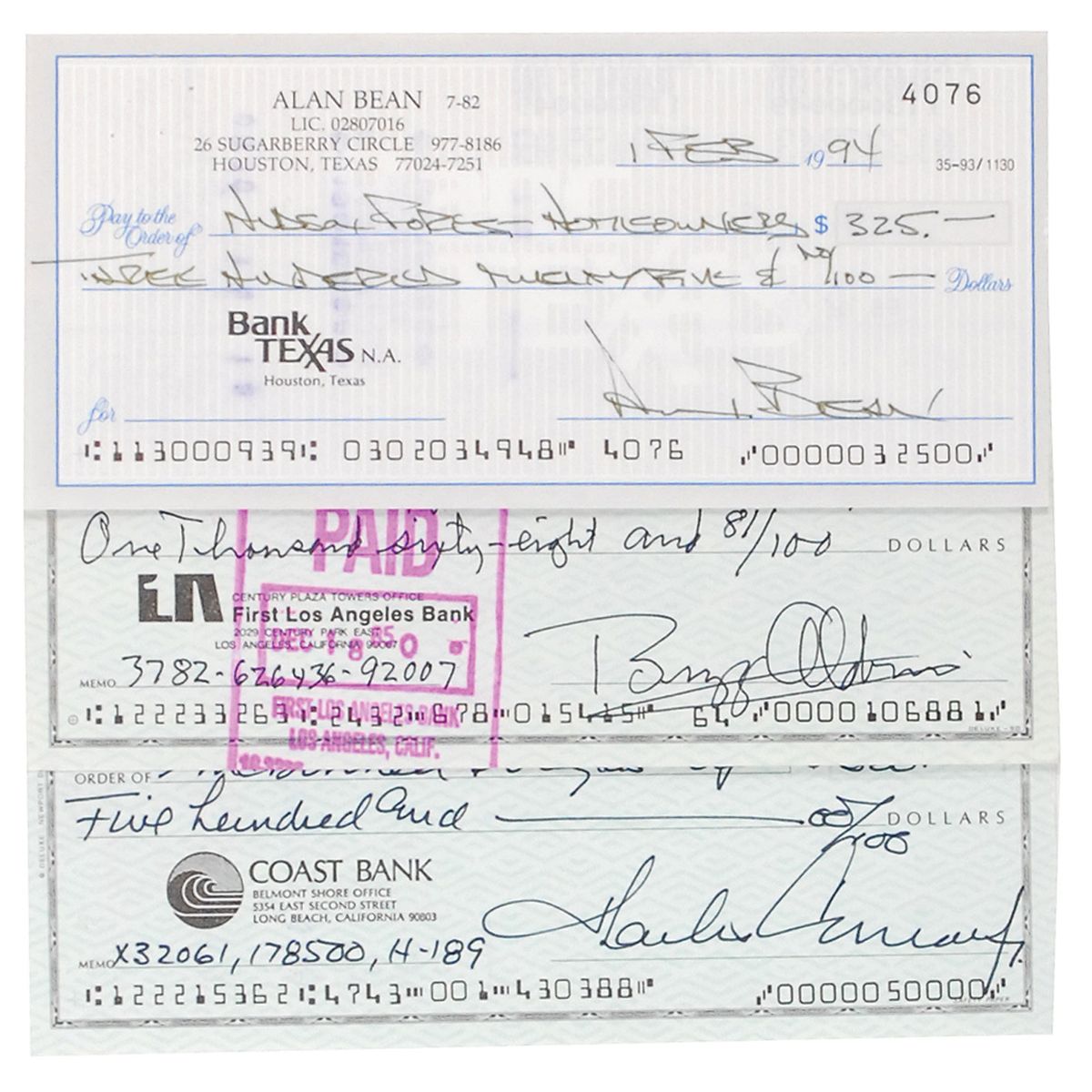 Collection of three personal and business checks, all 6 x 2.75, dated from the 1985–1994, each filled out and signed by a different Apollo astronaut. Signers are: Buzz Aldrin, Charles Conrad, and Alan Bean. In fine condition, with a bank stamp to front of Aldrin’s check.