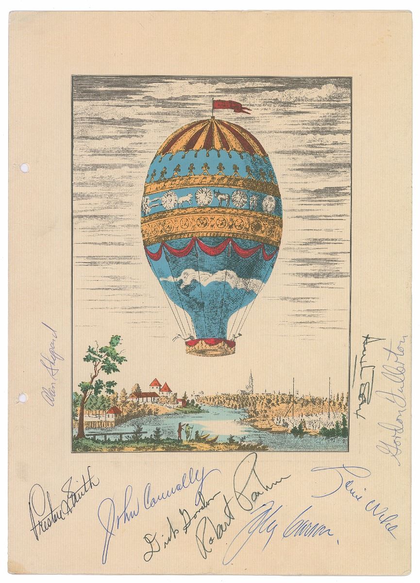 Program for an official state of Texas event honoring America’s astronauts held at the Shamrock Hilton Hotel in Houston on December 14, 1969, four pages, 9.5 x 13.5, signed on the front cover in felt tip and ballpoint by Alan Shepard, Alan Bean, Gordon Fullerton, Richard Gordon, Texas governors John Connally and Preston Smith, Mayor Louie Welch, and two others. Light soiling and small tears to two punch holes along the left edge, otherwise fine condition.
