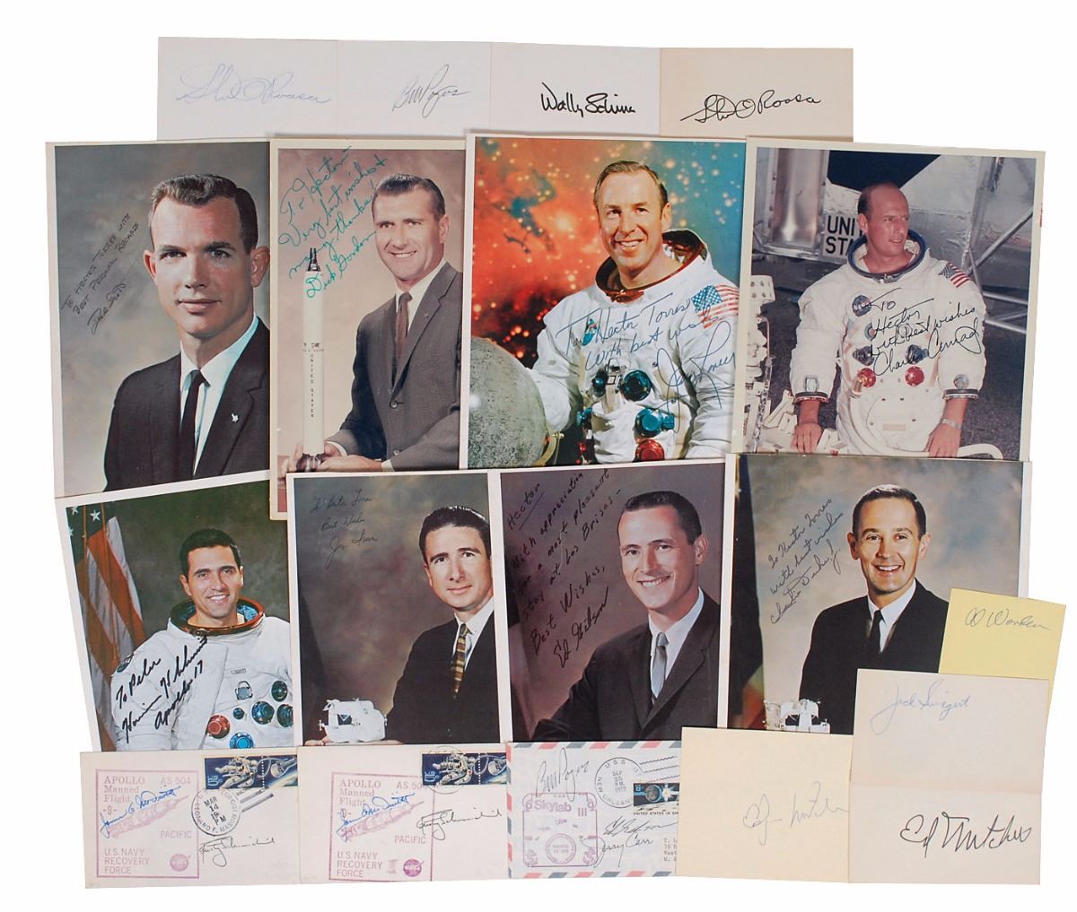 Large collection of nineteen items, consisting of photos, covers, and signatures, each signed by at least one astronaut, including: six signed and inscribed official color NASA lithographs of Harrison Schmitt, Jim Irwin, Ed Gibson, Charlie Duke, James Lovell, and Dave Scott; two official color glossy 'red-numbered' NASA photos of Charles Conrad and Dick Gordon, each signed and inscribed by the subject; two commemorative covers honoring Apollo 9, both signed by Jim McDivitt and Rusty Schweickart; a commemorative cover honoring Skylab, signed by Bill Pogue, Ed Gibson, and Jerry Carr; and signatures of Ed Mitchell (2), Al Worden, Jack Swigert, Wally Schirra, Stu Roosa (2), and Bill Pogue on individual off-white cards. Several of the photos have slightly trimmed edges, otherwise in overall fine condition.