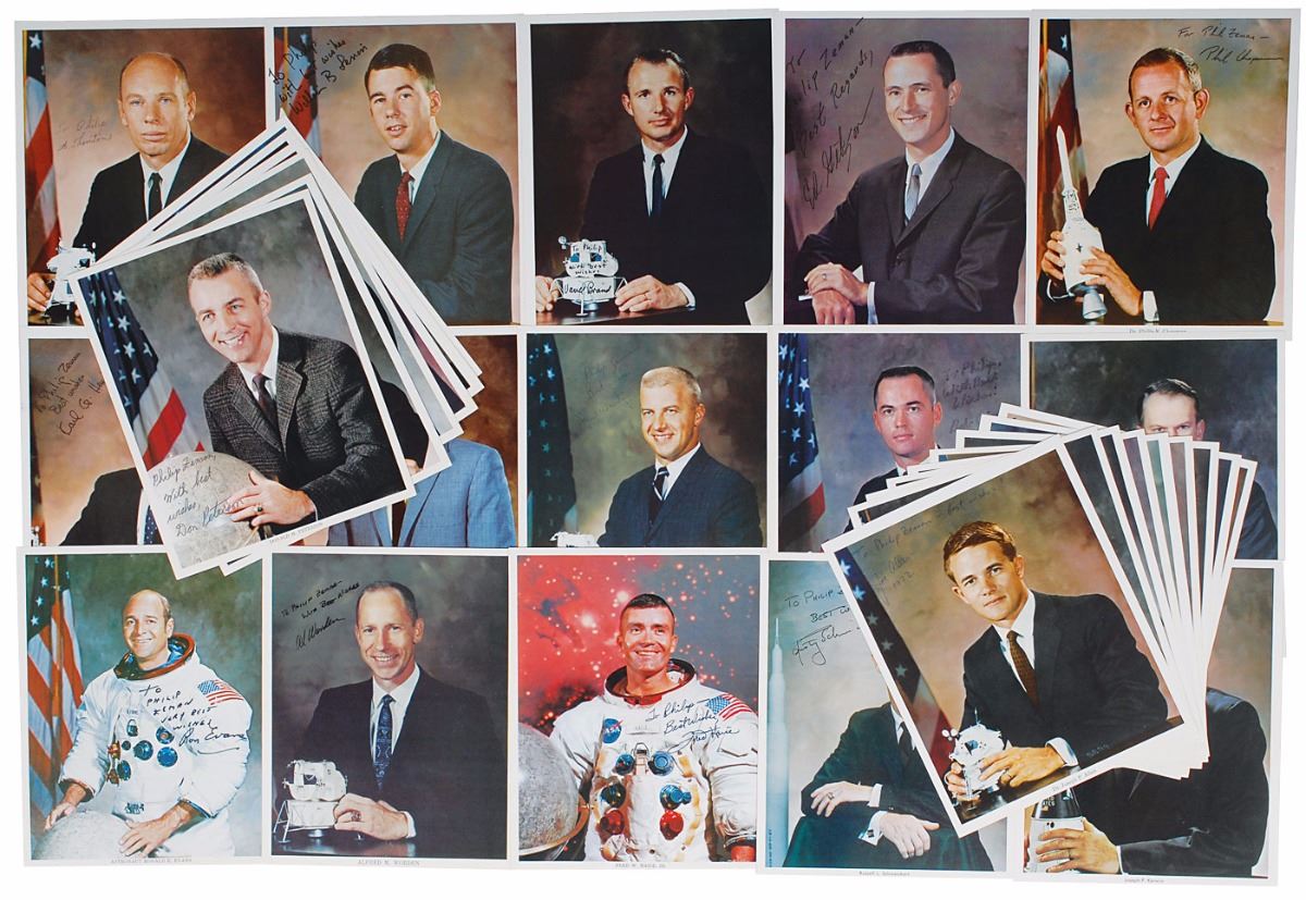 Impressive collection of thirty official color NASA lithographs, all but one measuring 8 x 10, signed and inscribed in ink and felt tip by the astronaut pictured, including: Stuart A. Roosa, Ron Evans, Al Worden, Fred Haise, Rusty Schweickart, Joe Kerwin, Joe Allen, Hank Hartsfield, Bill Pogue, Gordon Fullerton, Bruce McCandless II, Bob Overmyer, Jack Lousma, Joe Engle, Robert Parker, Don Peterson, Owen Garriott, Richard Truly, Don Lind, Jerry Carr, Karol Bobko, Bob Crippen, Story Musgrave, Paul Weitz, Karl Henize, Ed Gibson, Phil Chapman, Vance Brand, William B. Lenoir, and William Thornton. In overall fine condition.