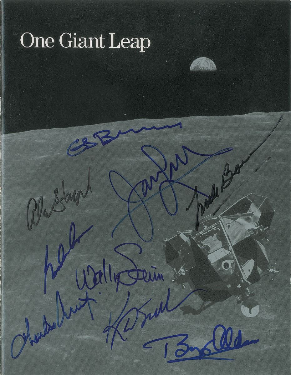 Program for One Giant Leap, The Third Annual Salute to Aviation, 8.5 x 11, 28 pages, held on September 20, 1996 at the Museum of Flying in Santa Monica, California. Signed on the front cover in blue or black felt tip by Buzz Aldrin, Charles Conrad, Alan Shepard, James Lovell, Gordon Cooper, Wally Schirra, Frank Borman, Guion S. Bluford, and Kathryn Sullivan. In fine condition.