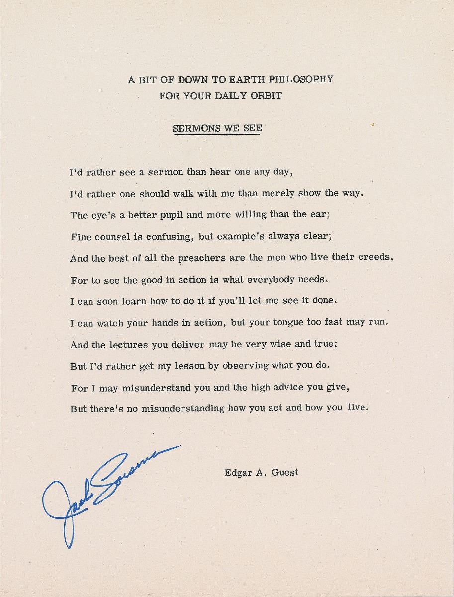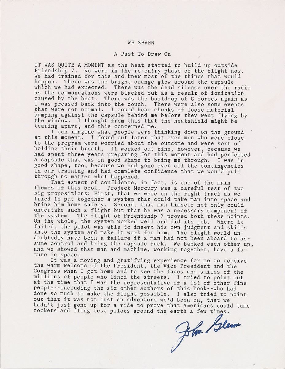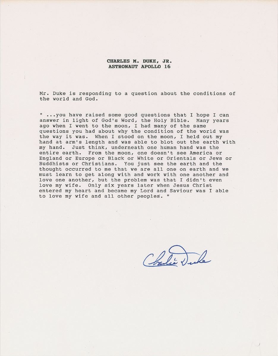 Three souvenir typescripts, each one page, ranging in size from 8 x 10.5 to 8.5 x 11, individually signed in ink or felt tip by Jack Lousma, John Glenn, and Charlie Duke. In overall fine condition.
